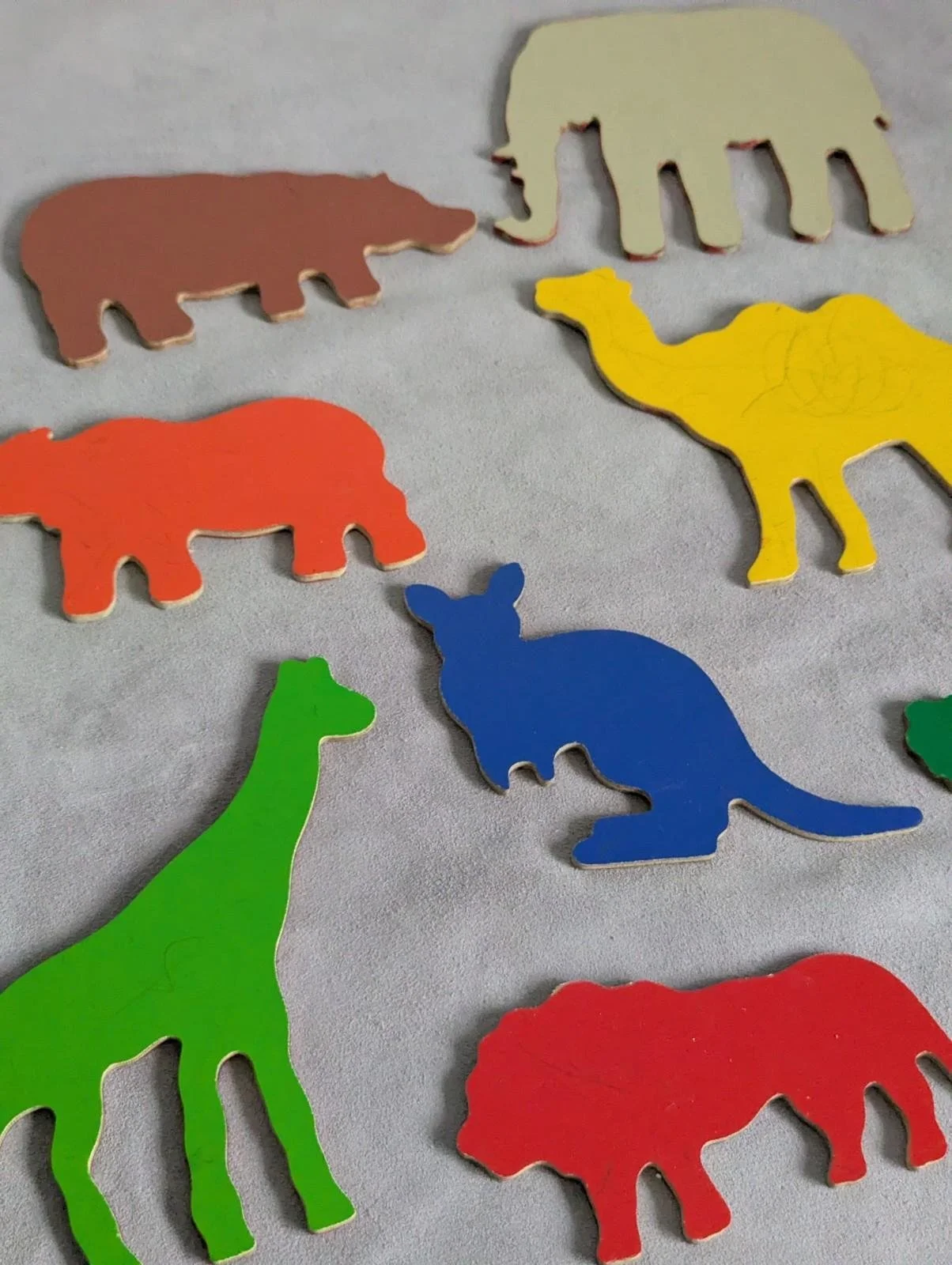 Bright and colourful set of 10 plywood animal shapes made by Galt Toys in the 1970s or 1980s. Missing their box, but the set contains a variety of safari animals, each painted one side and plain plywood the other. Includes ostrich, camel, elephant, hippo, rhino, kangaroo, lion and giraffe.