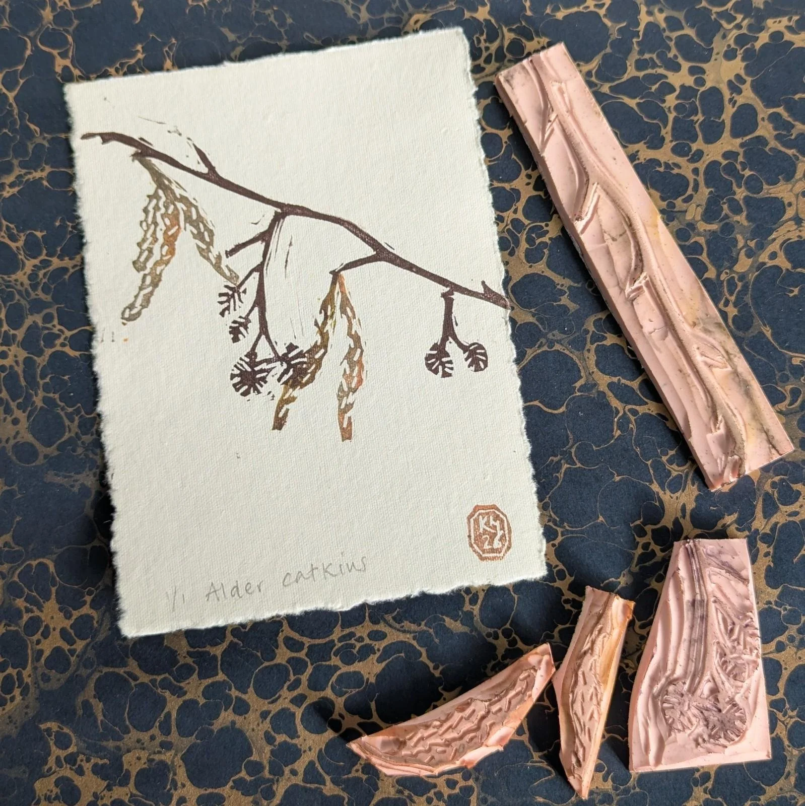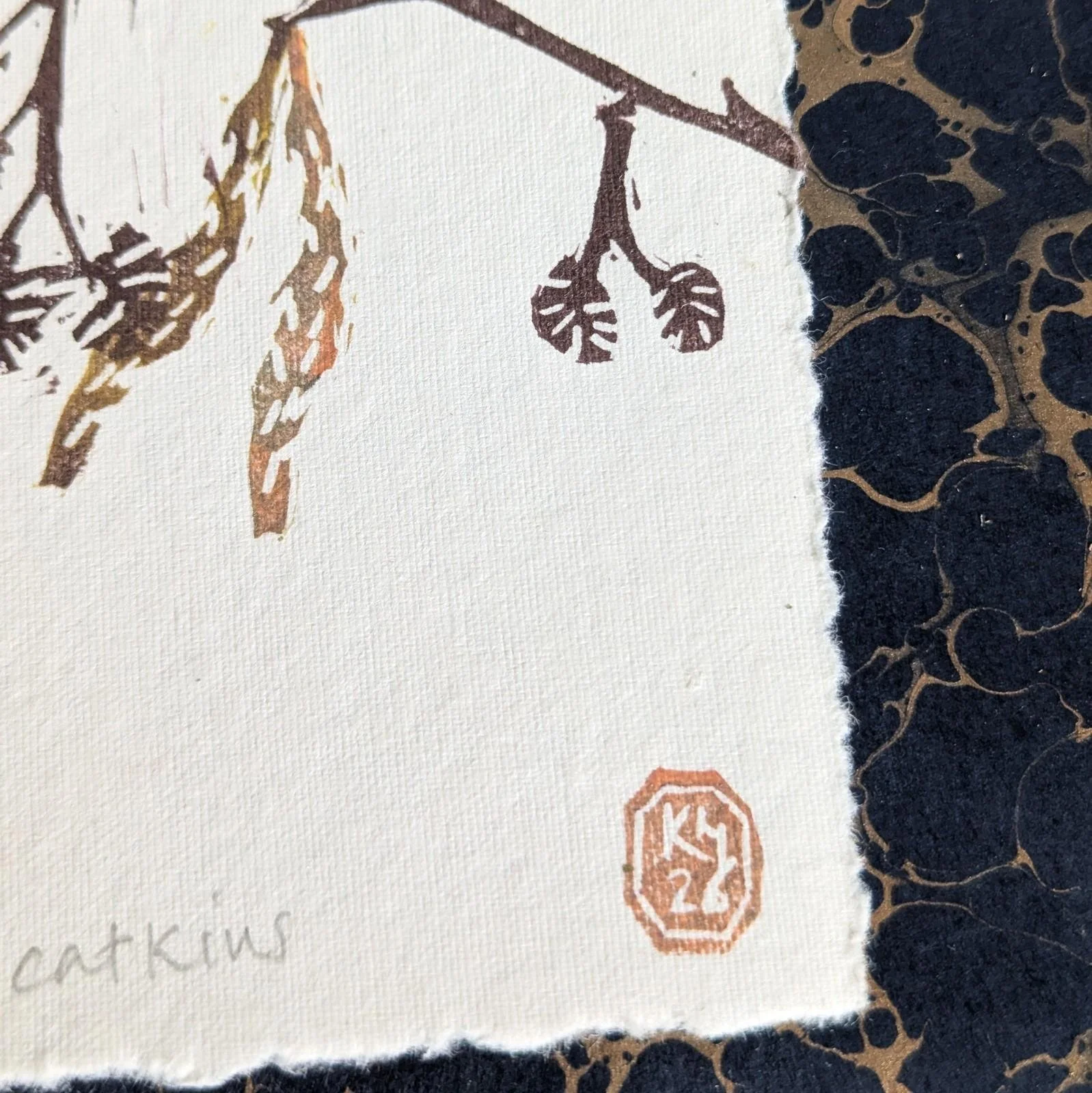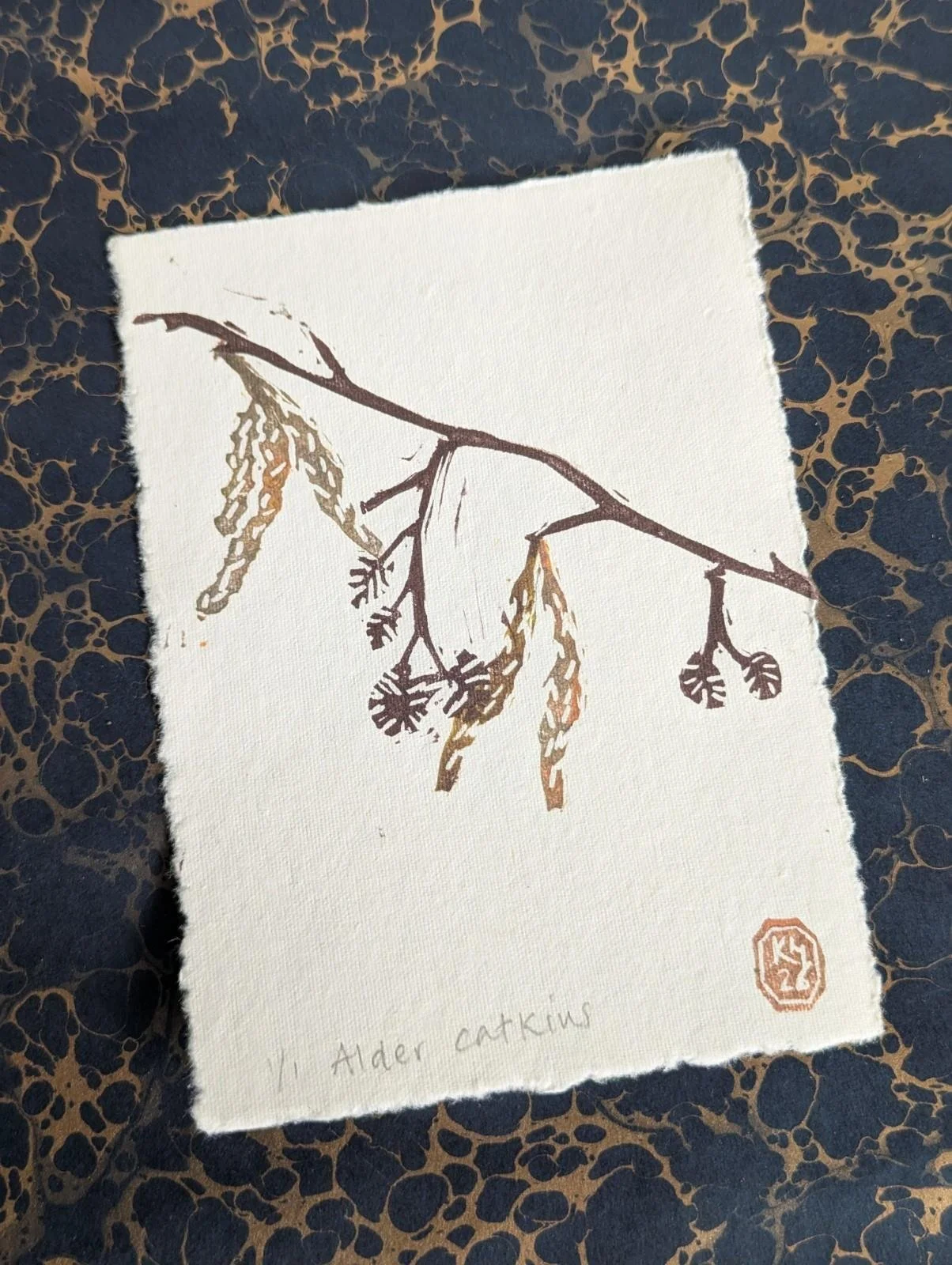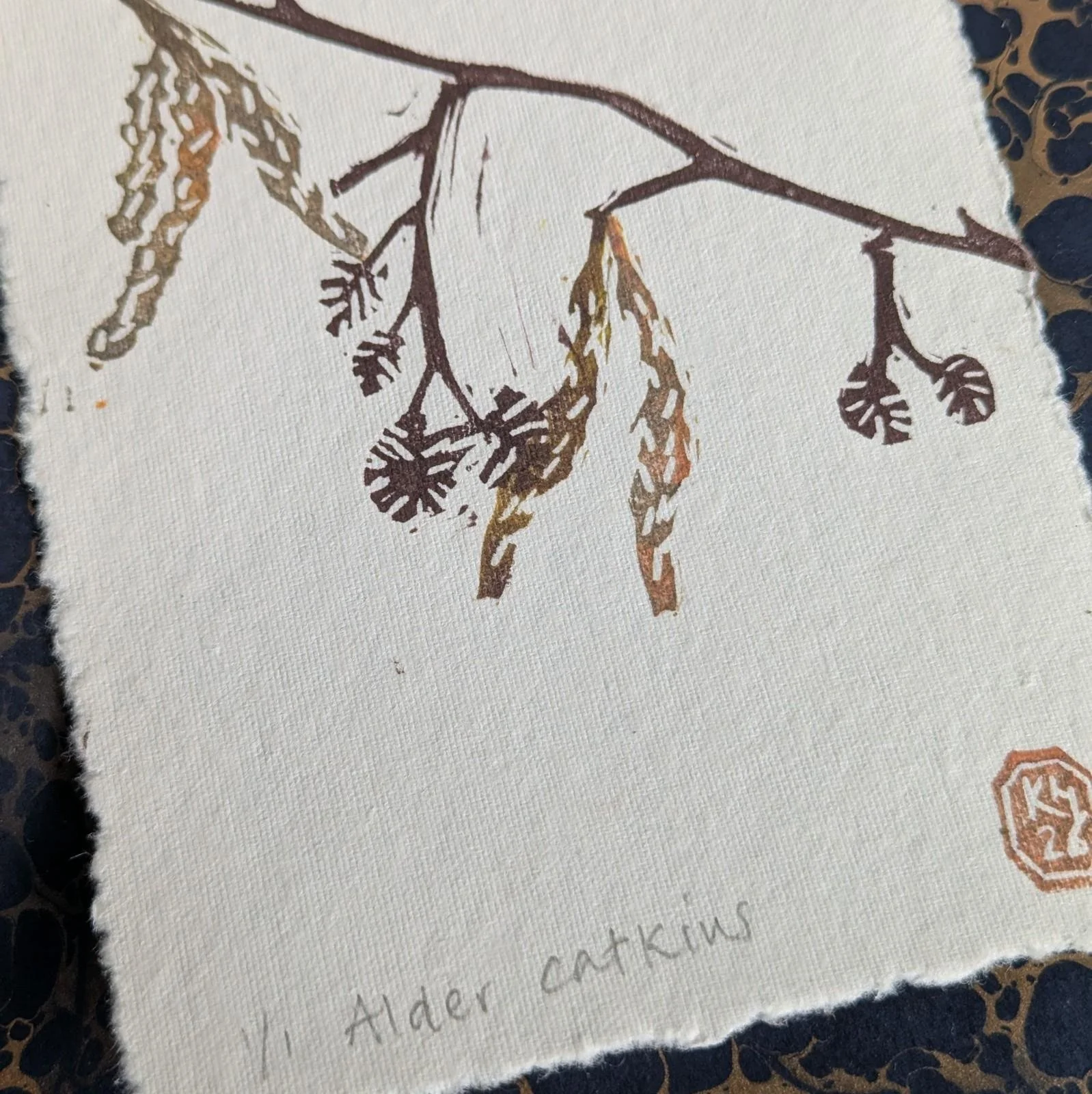 Alder catkins - original lino print - multicolour monoprint | 5x7 inches
