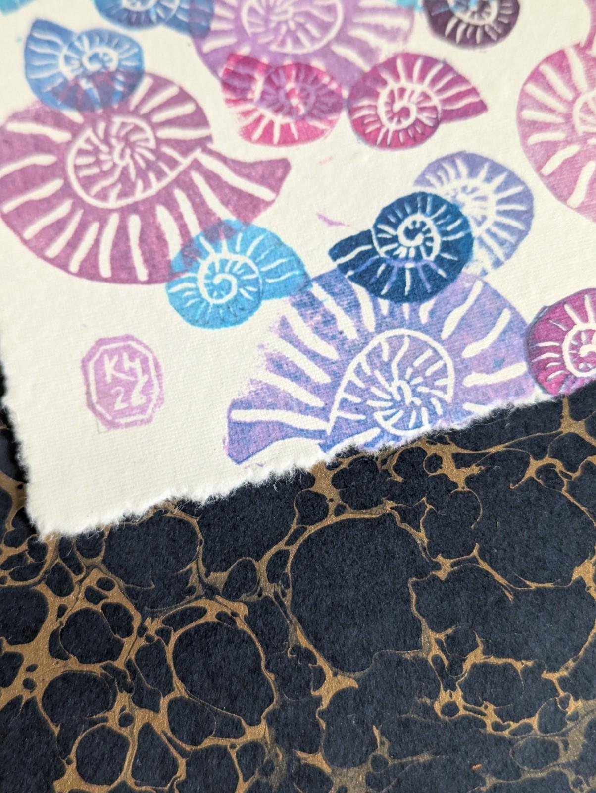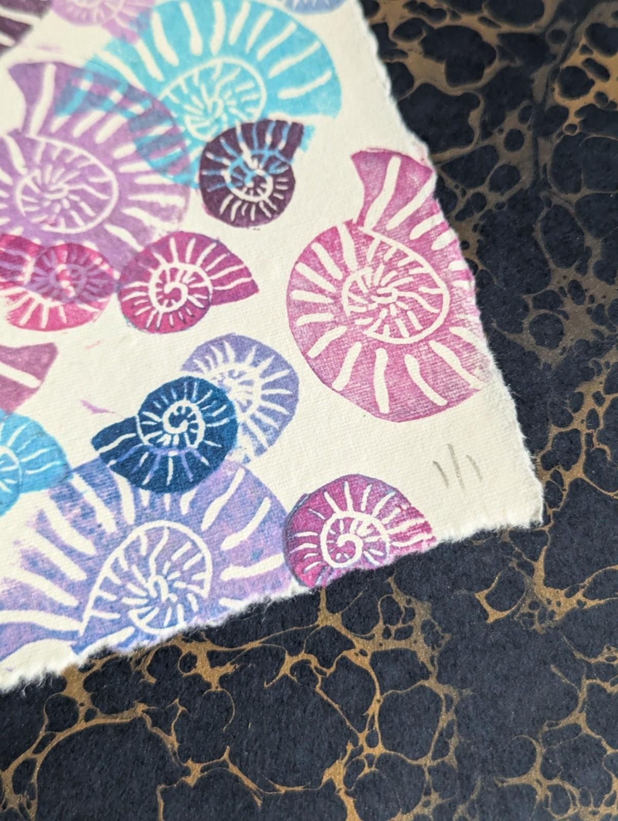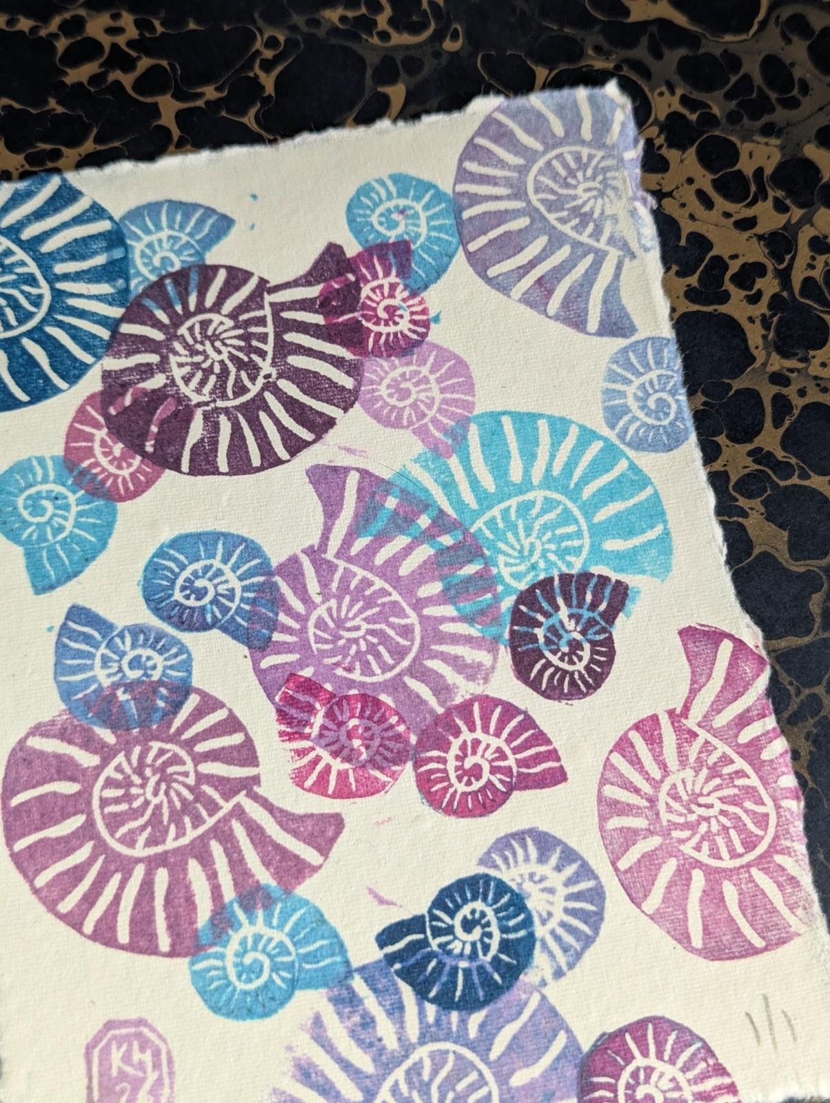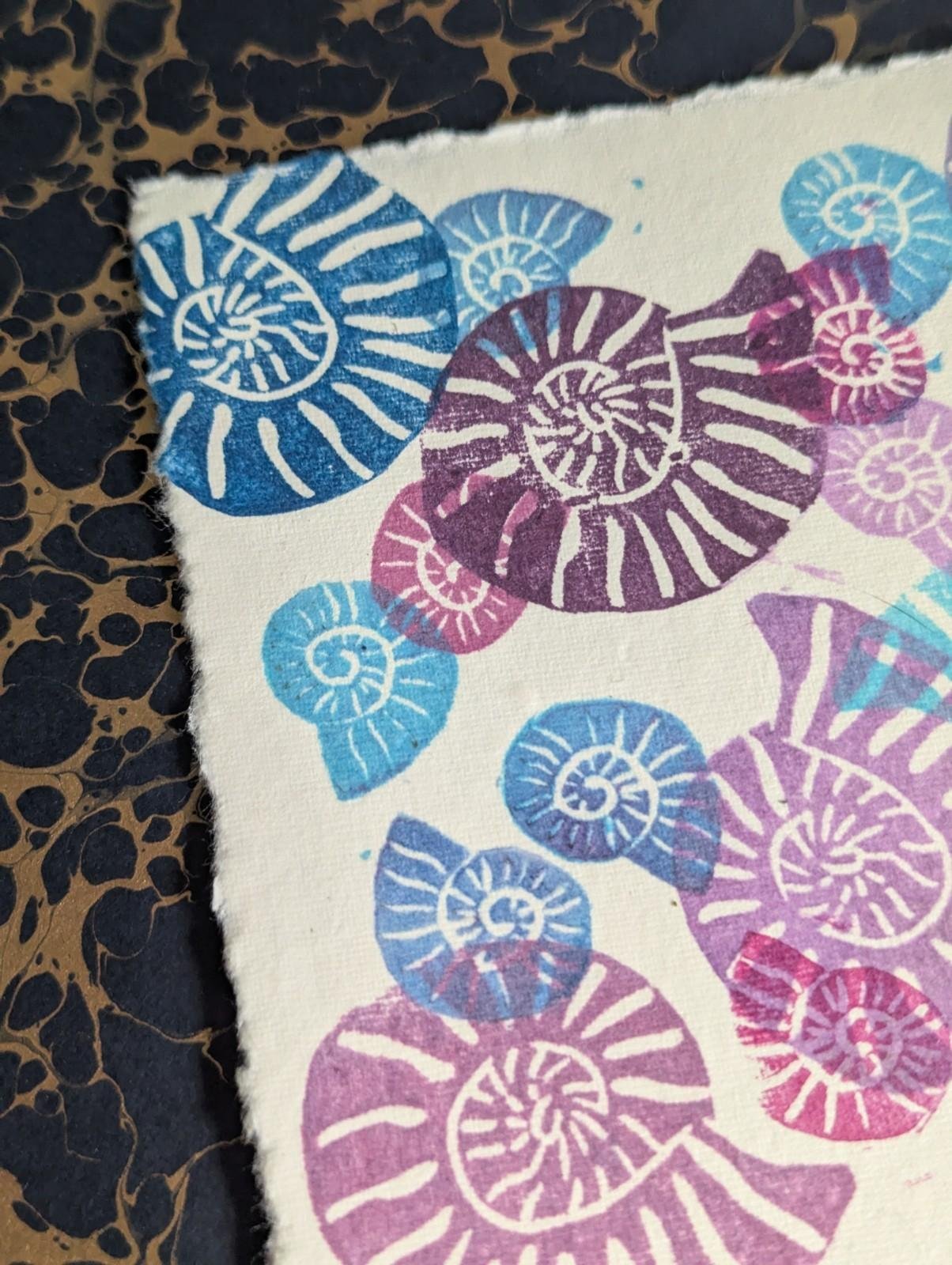 Ammonite Blues Purples - original lino print - multicolour monoprint 5x7 Inches
