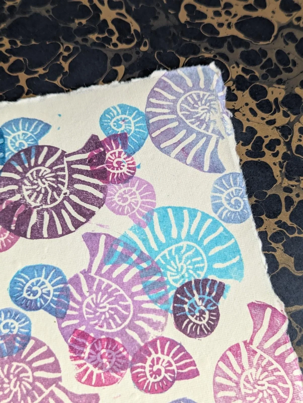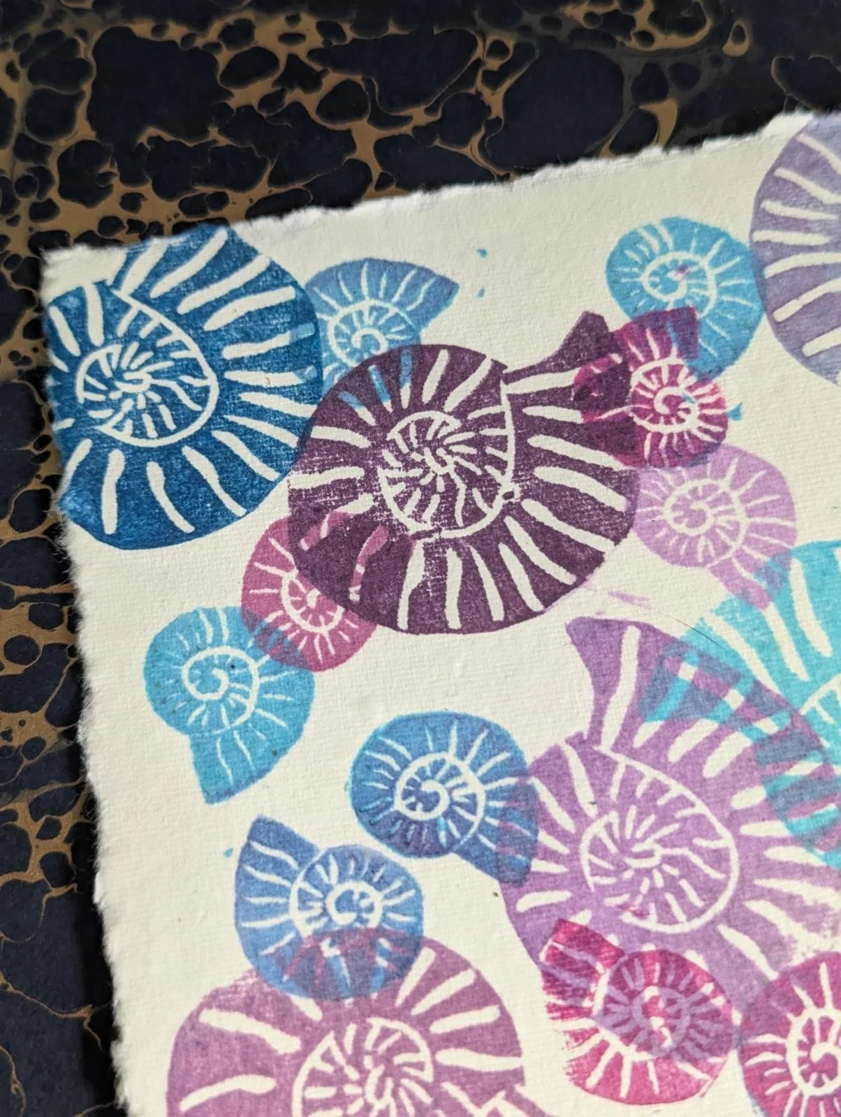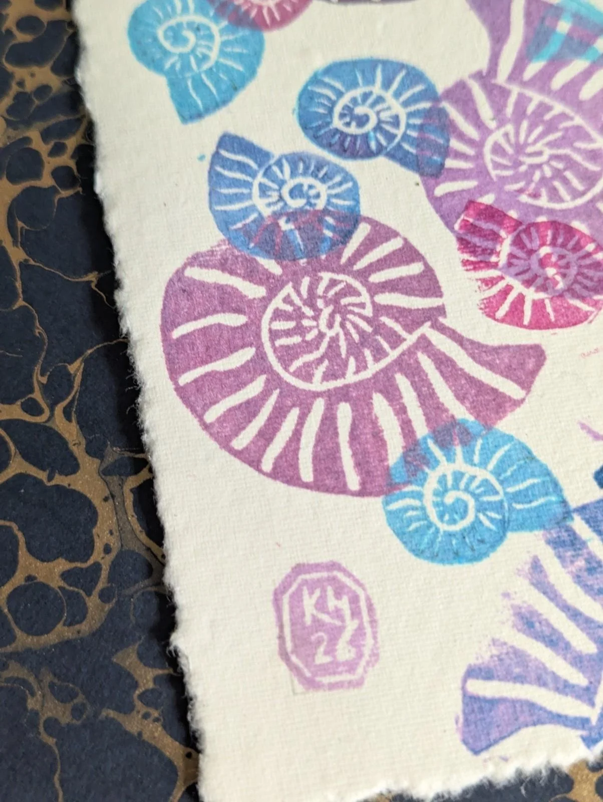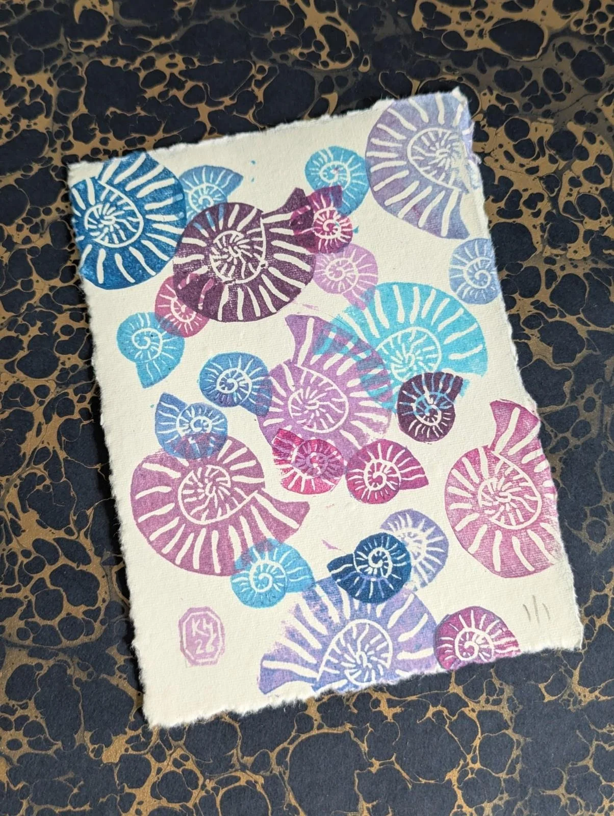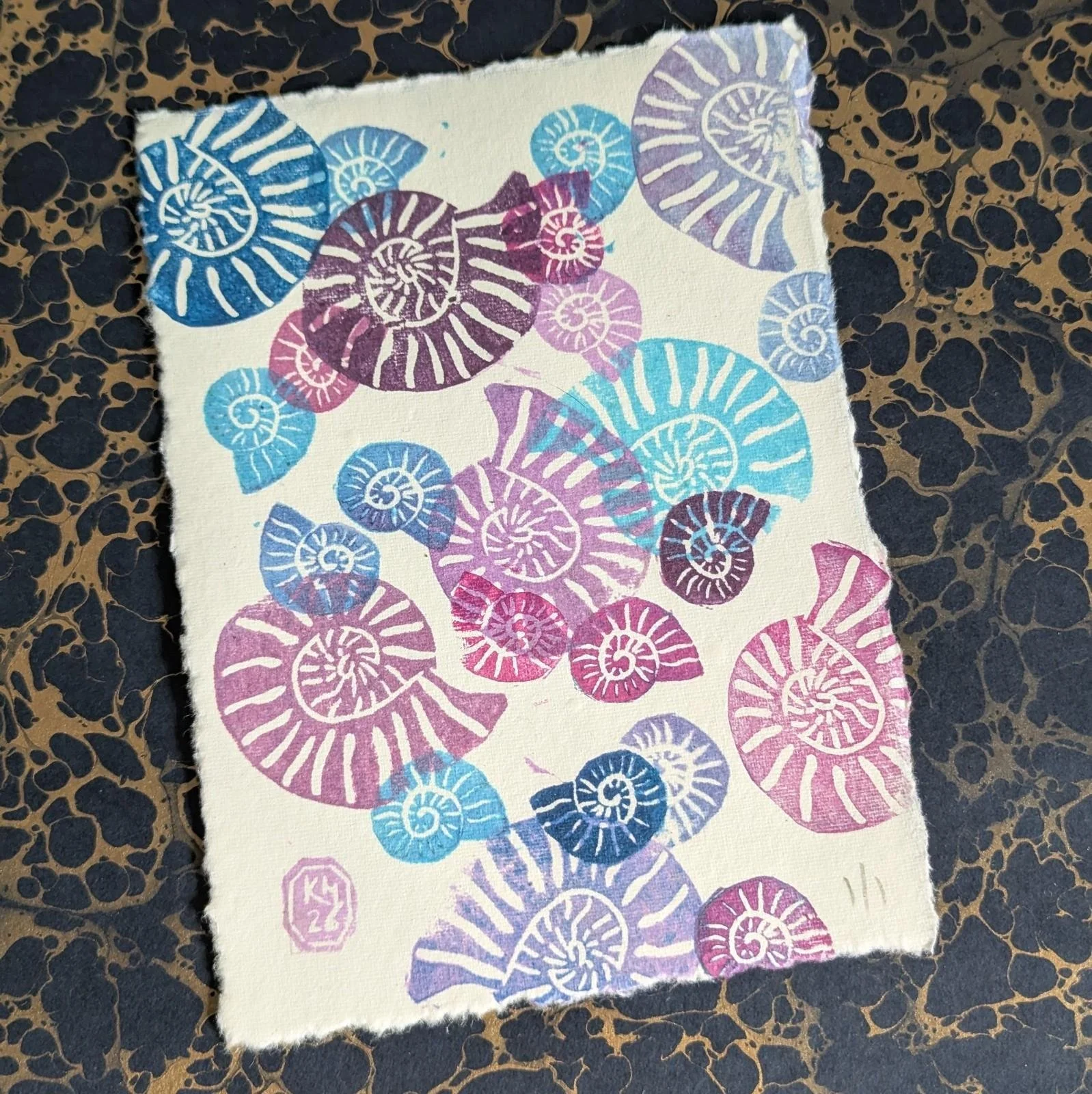 Ammonite Blues Purples - original lino print - multicolour monoprint 5x7 Inches