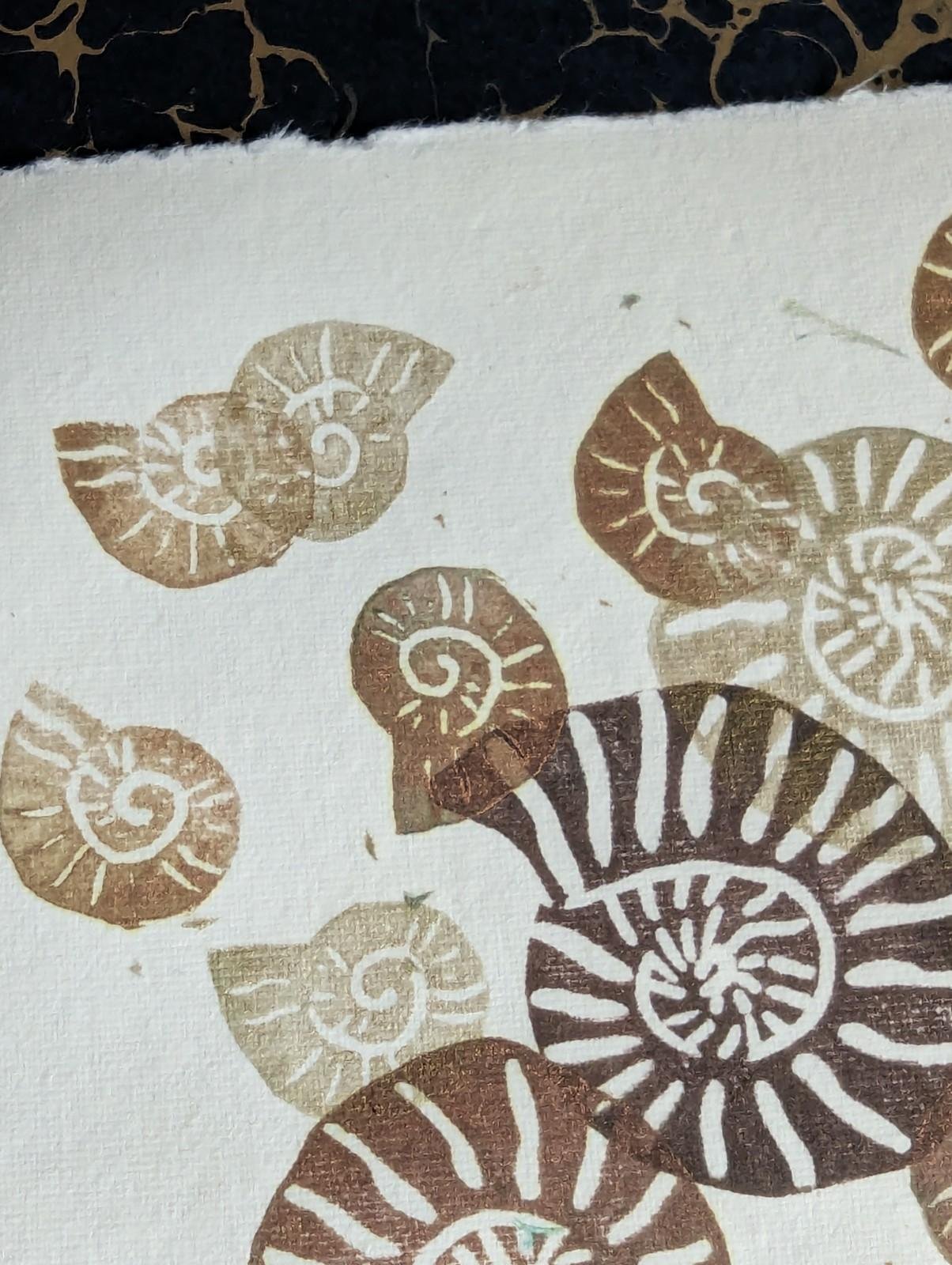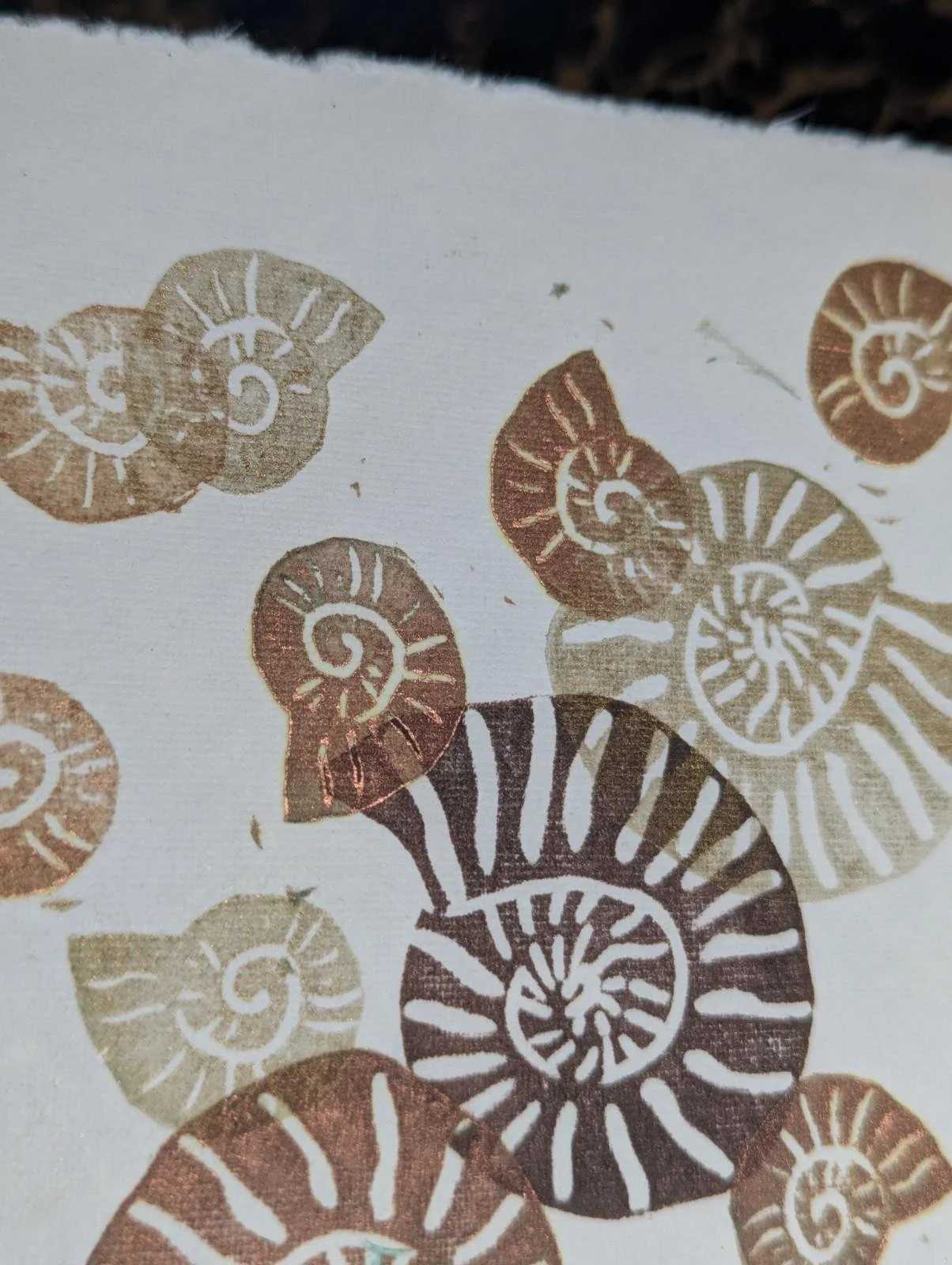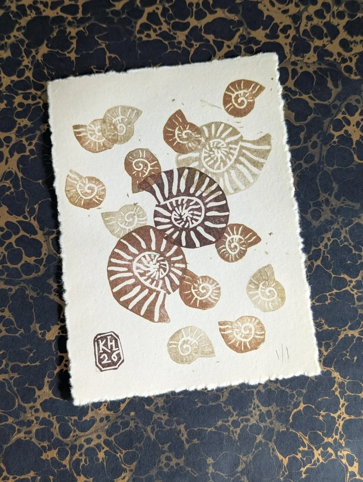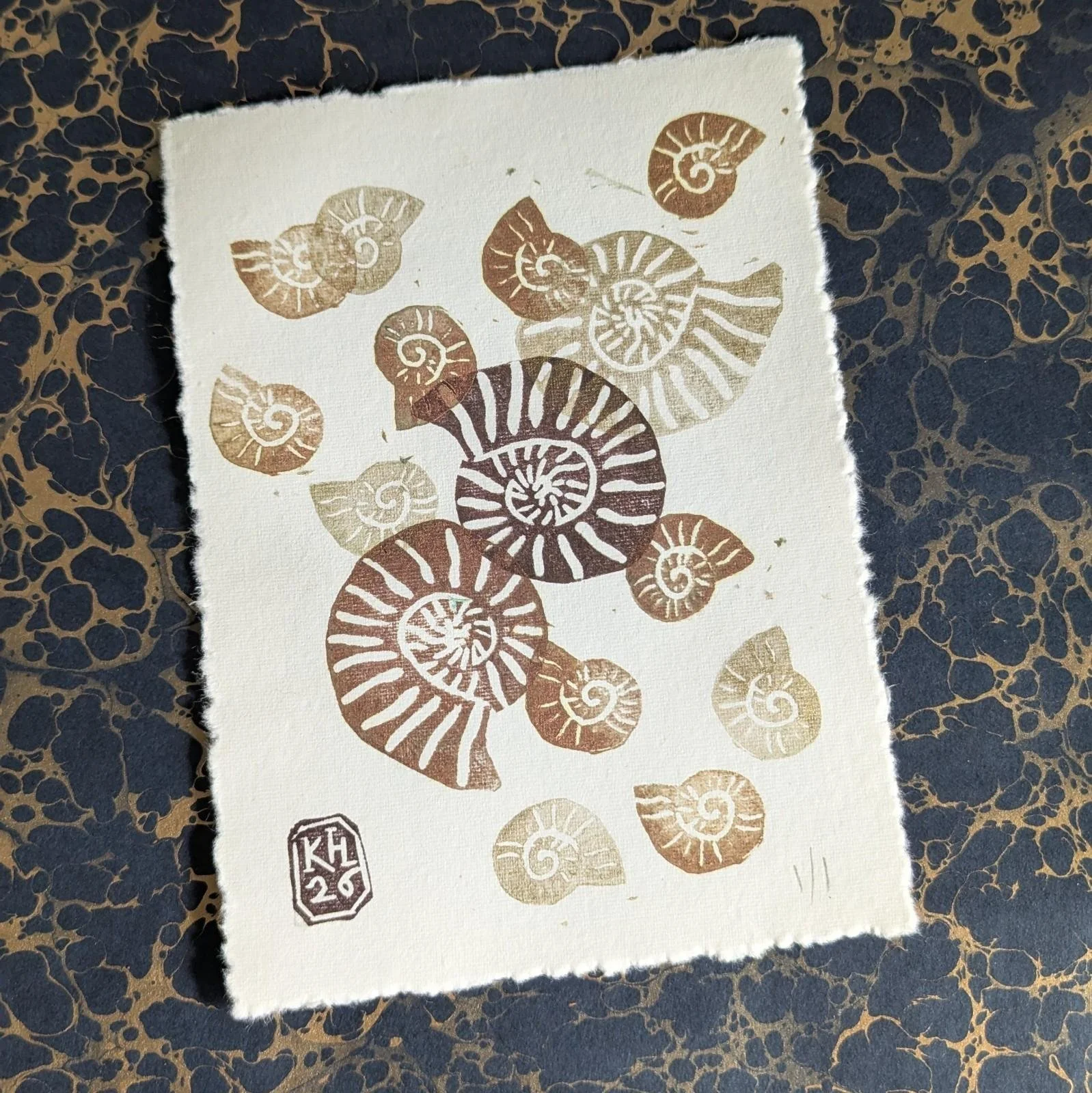 Ammonite Copper - original lino print - multicolour monoprint 5x7 Inches