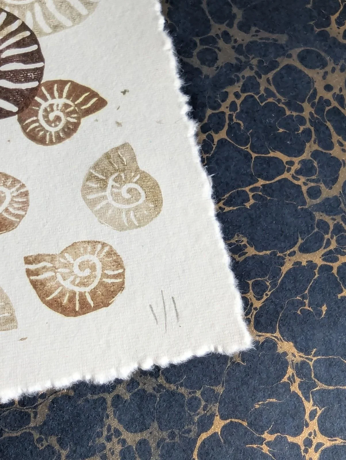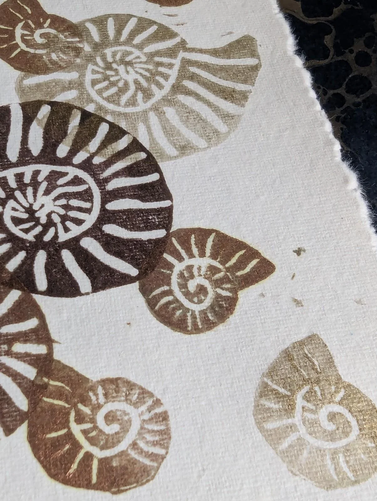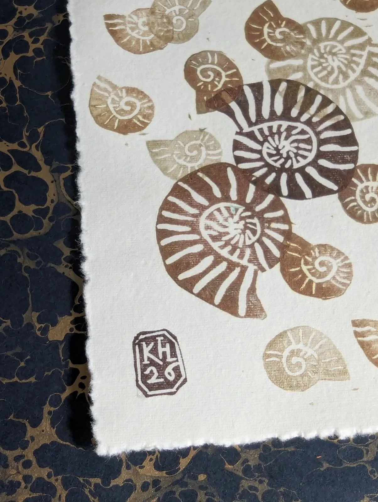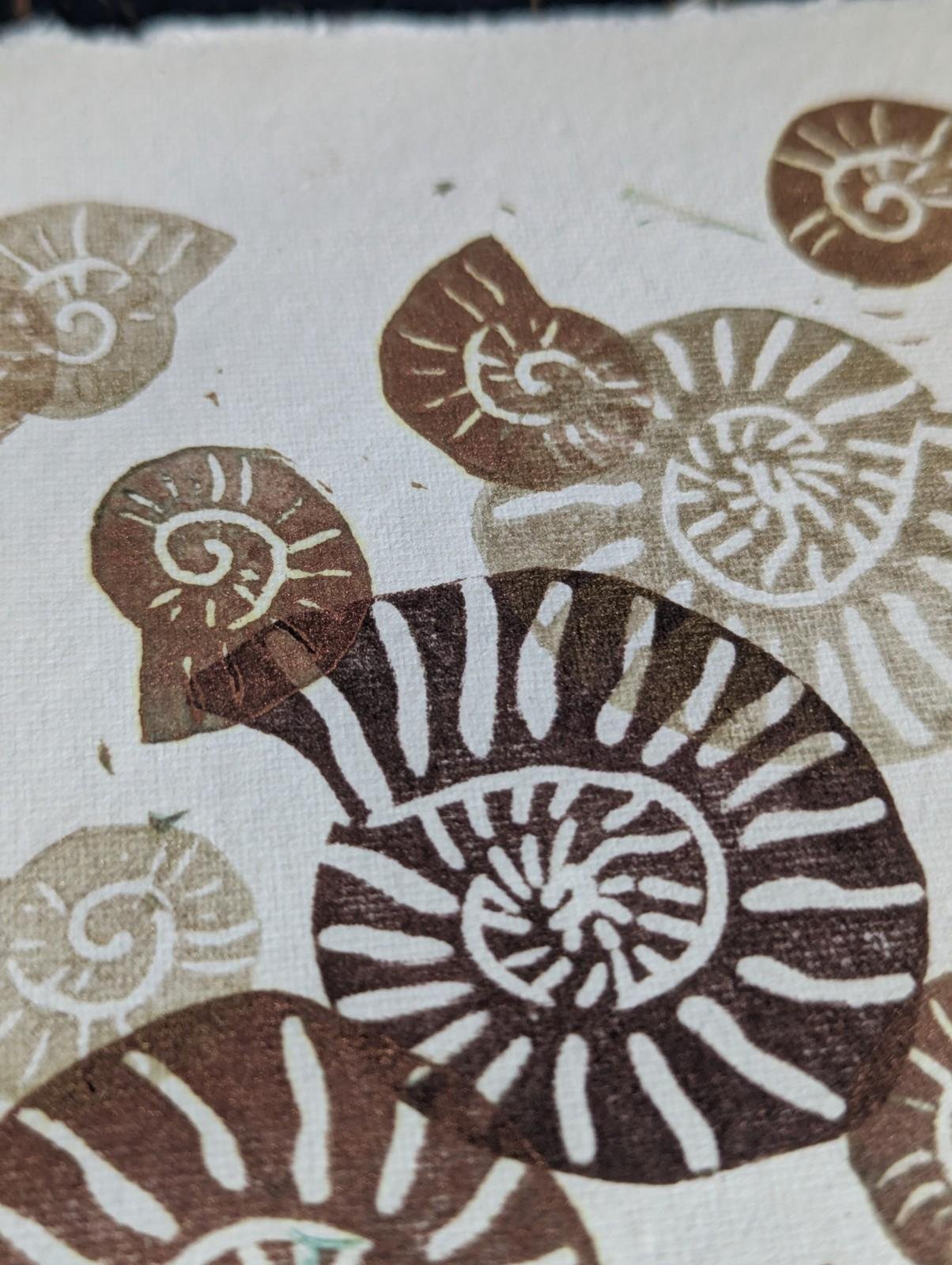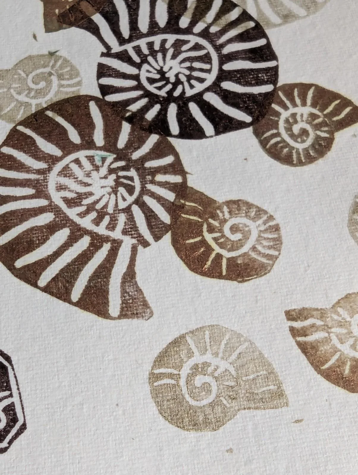 Ammonite Copper - original lino print - multicolour monoprint 5x7 Inches