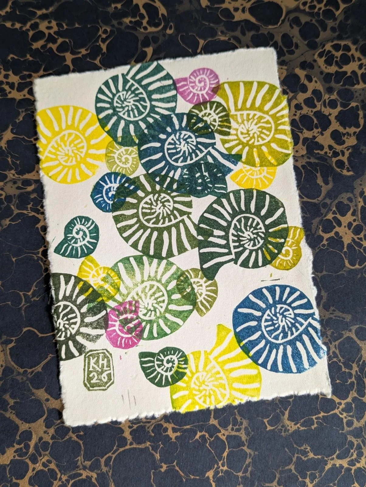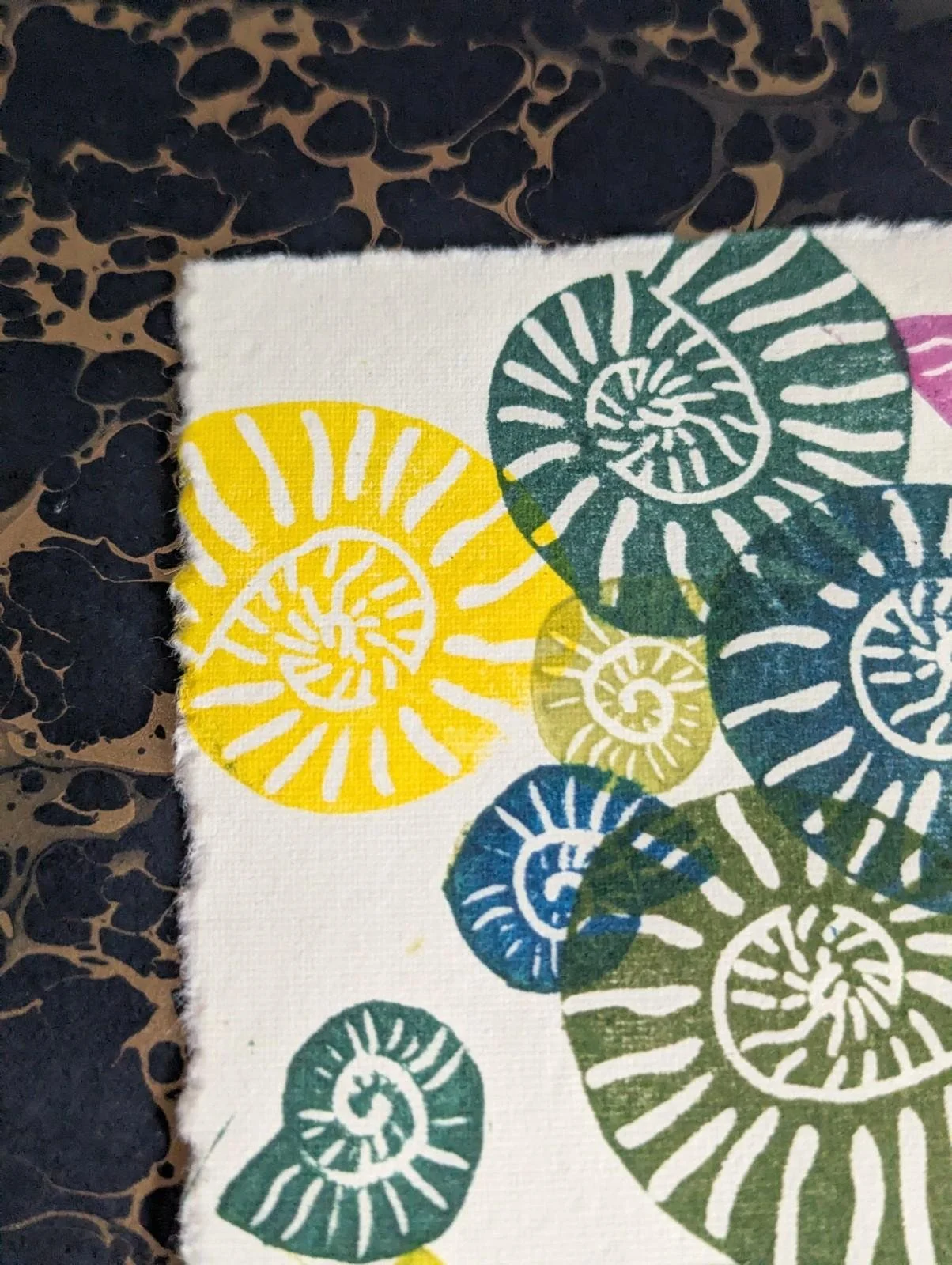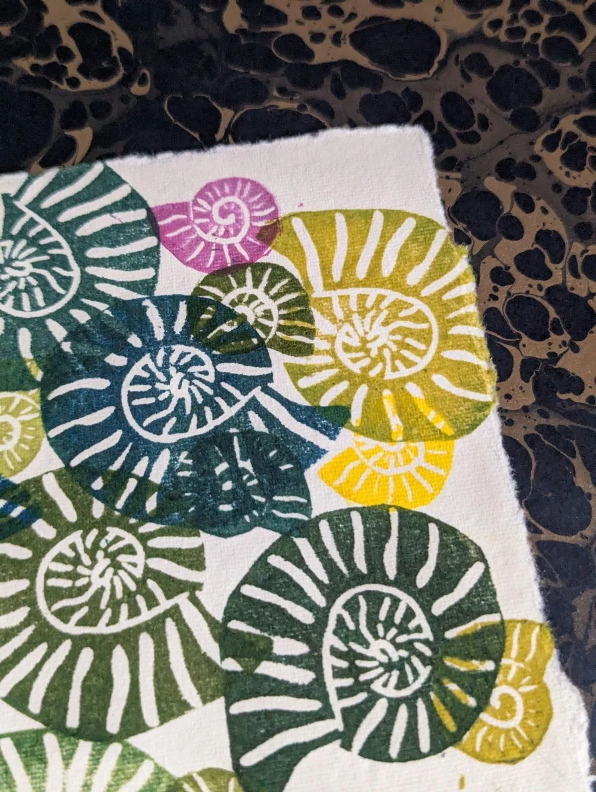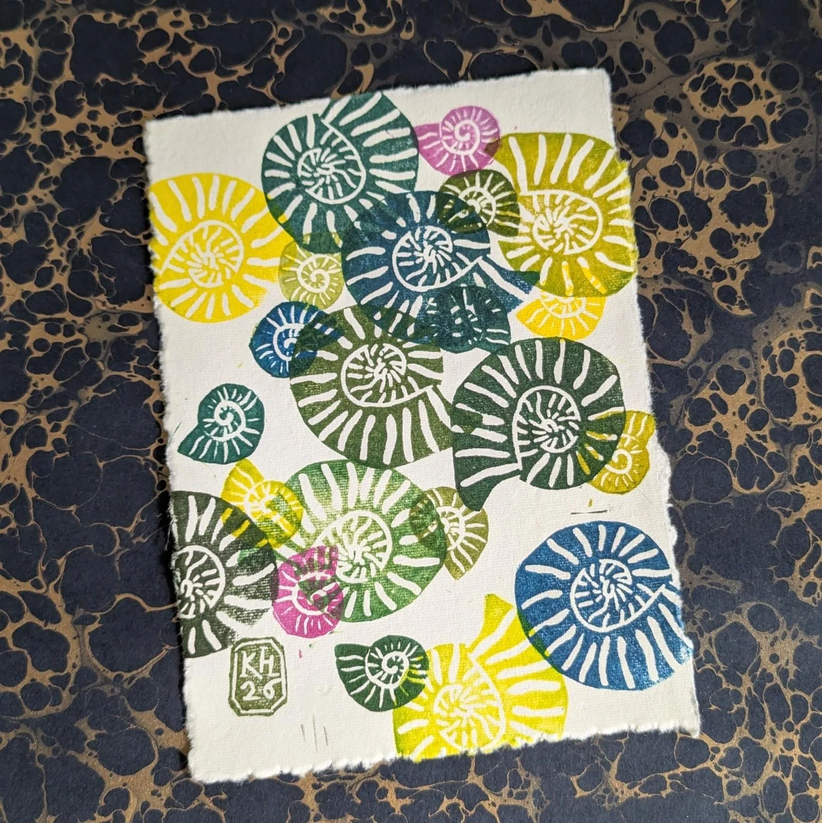 Ammonite Green Tones - original lino print - multicolour monoprint 5x7 Inches
