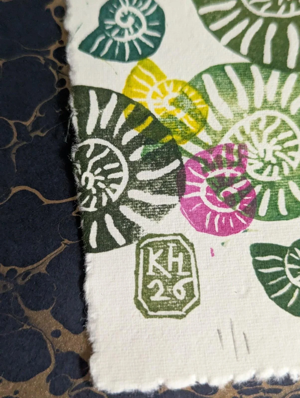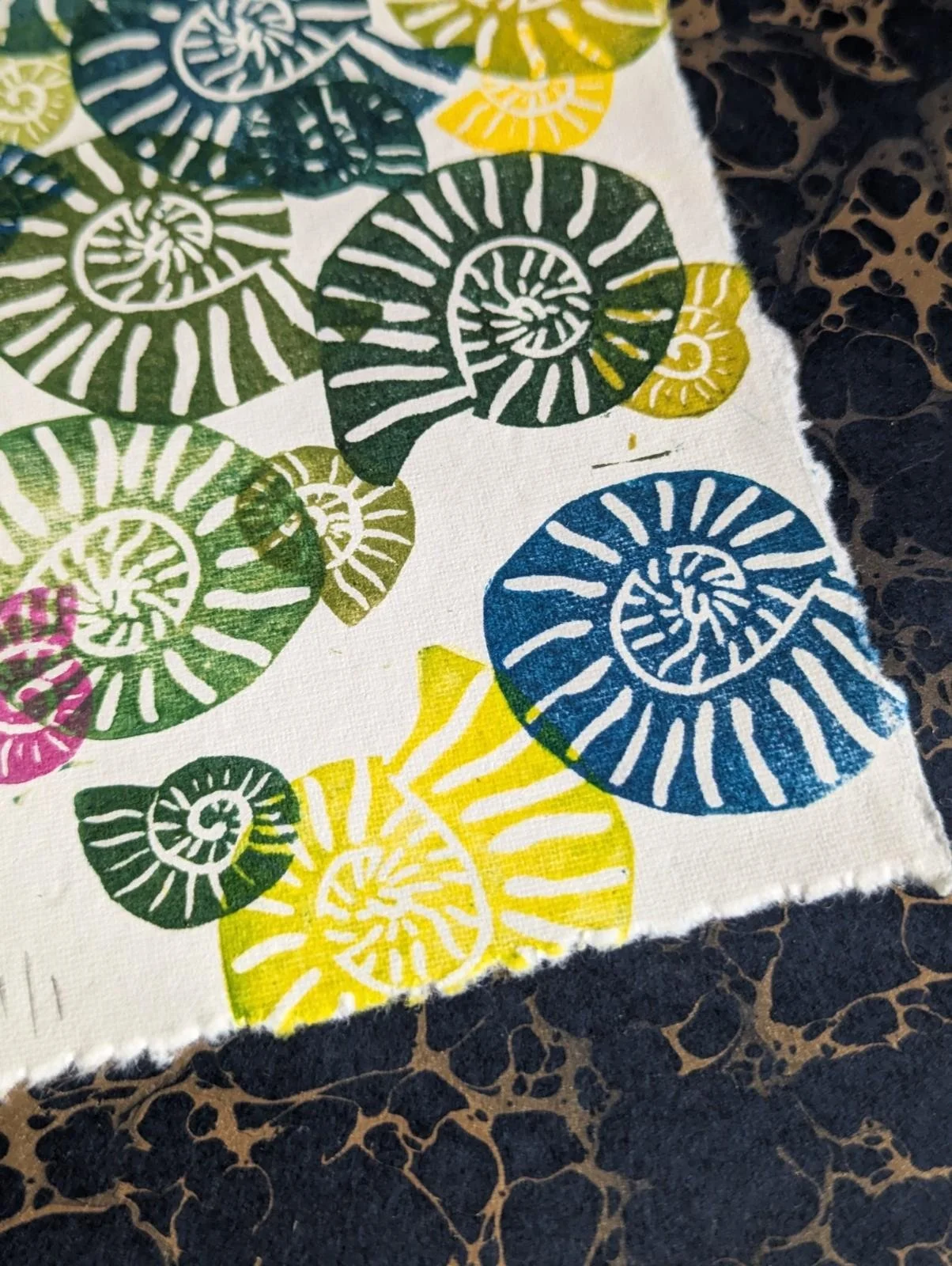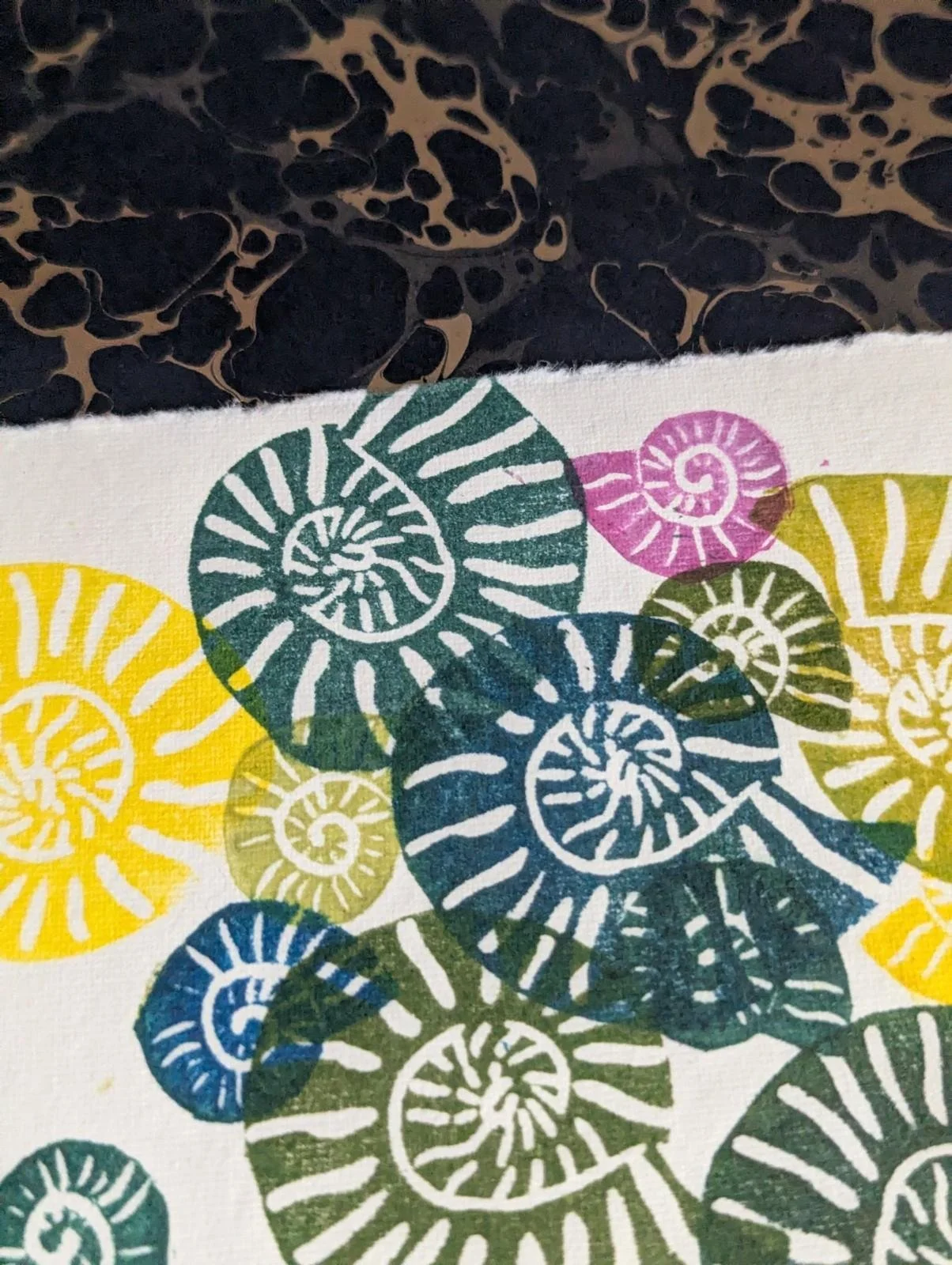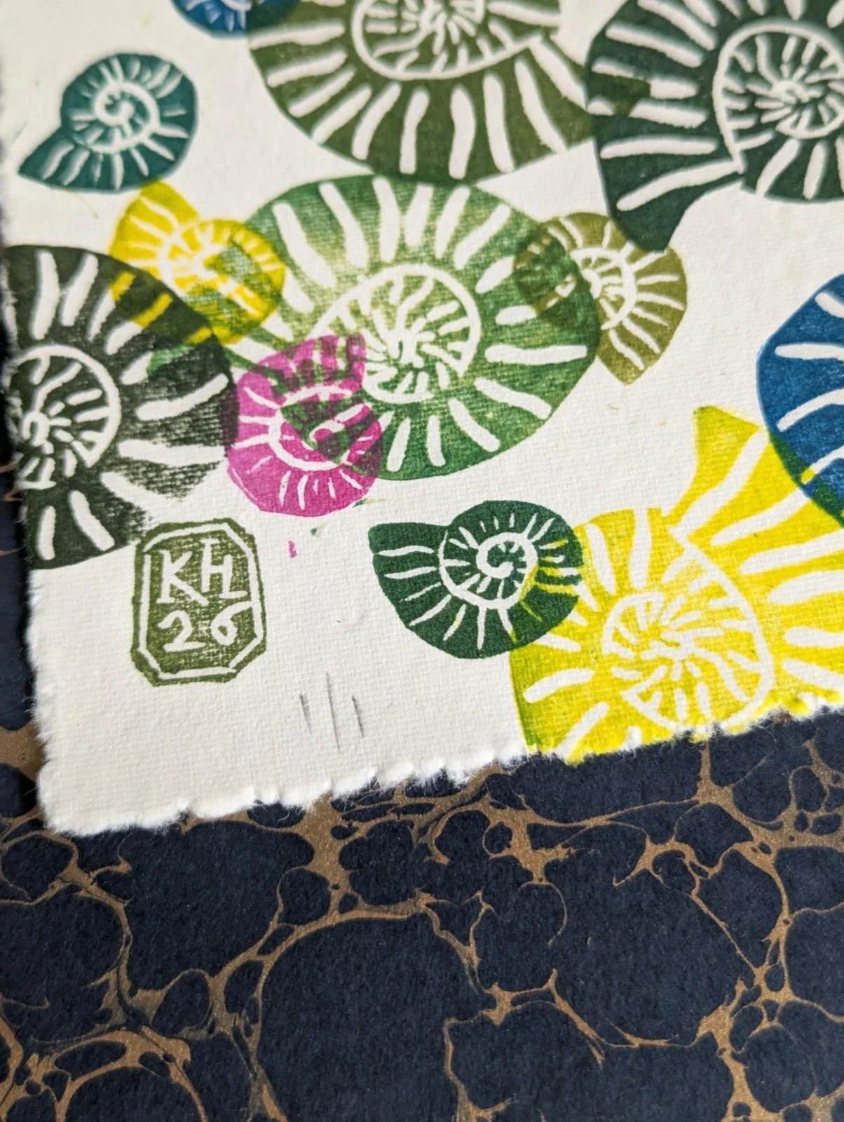 Ammonite Green Tones - original lino print - multicolour monoprint 5x7 Inches
