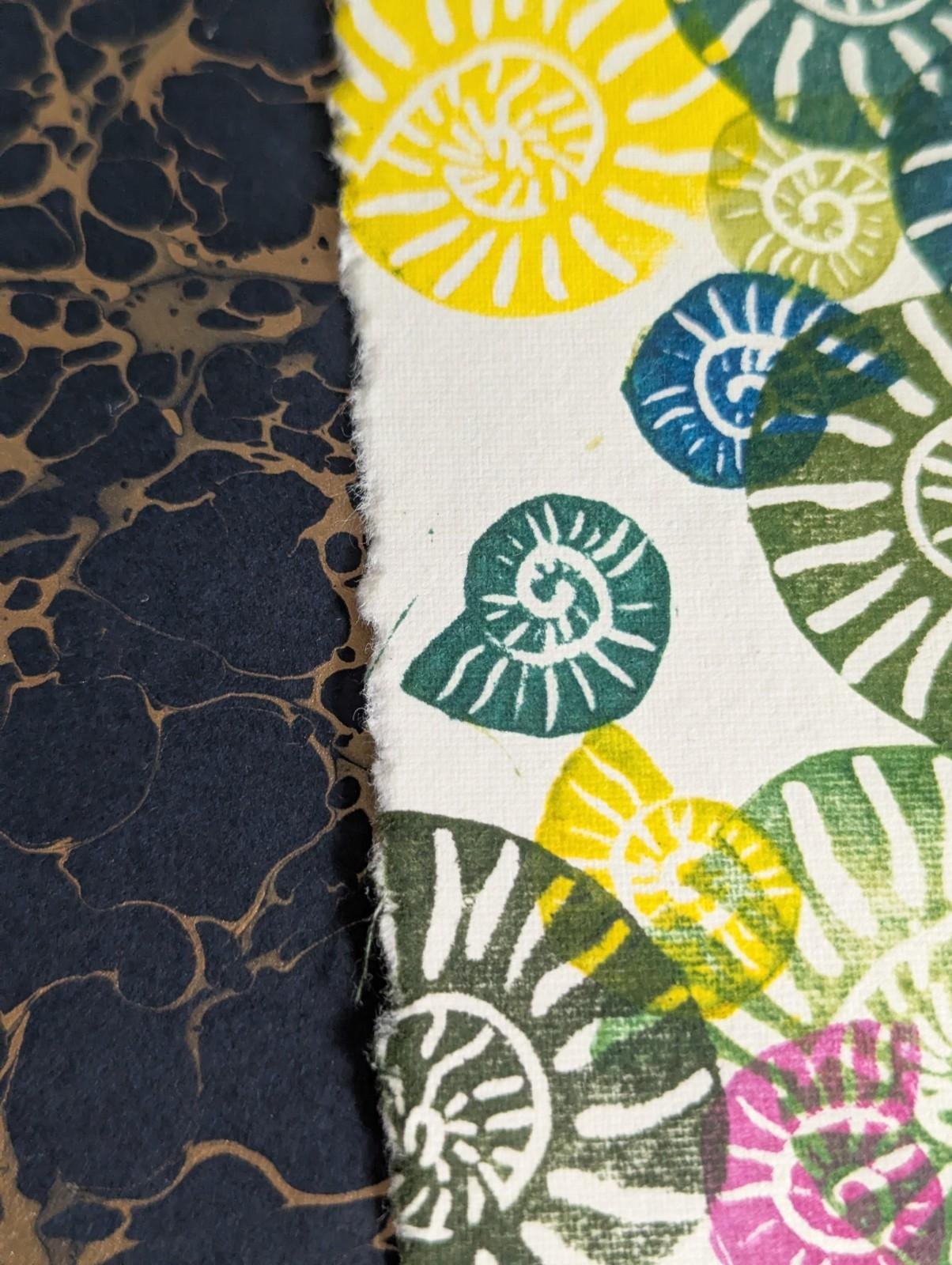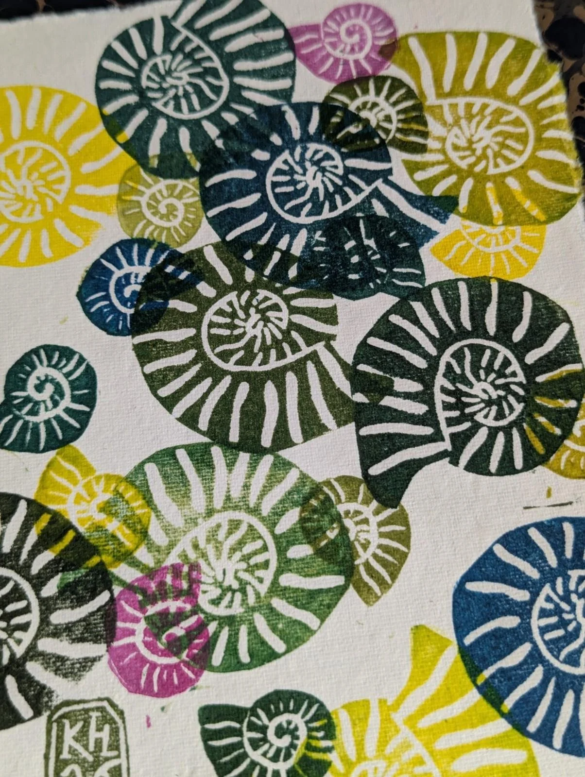A modular, original lino print of the repeating forms of a cluster of ammonite fossils. A layered mix of yellows, greens and blues with a few pinks thrown in for a pop of colour, reflecting the chaotic beauty of a bed of fossils where each animal or plant settled millions of years ago. Each print is made by printing individual blocks with different colour combinations and placement, so each composition is completely unique.