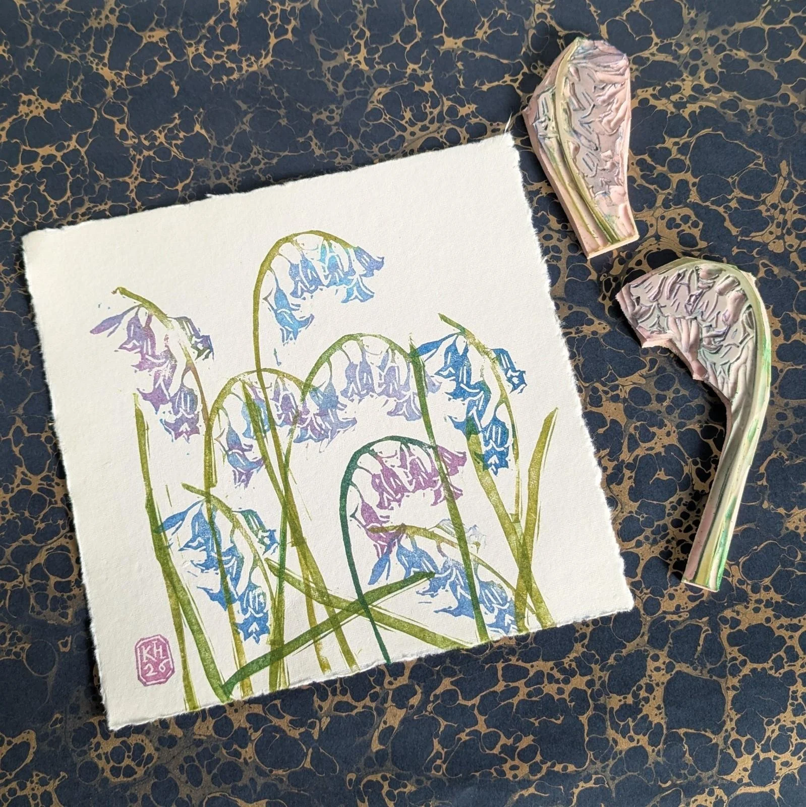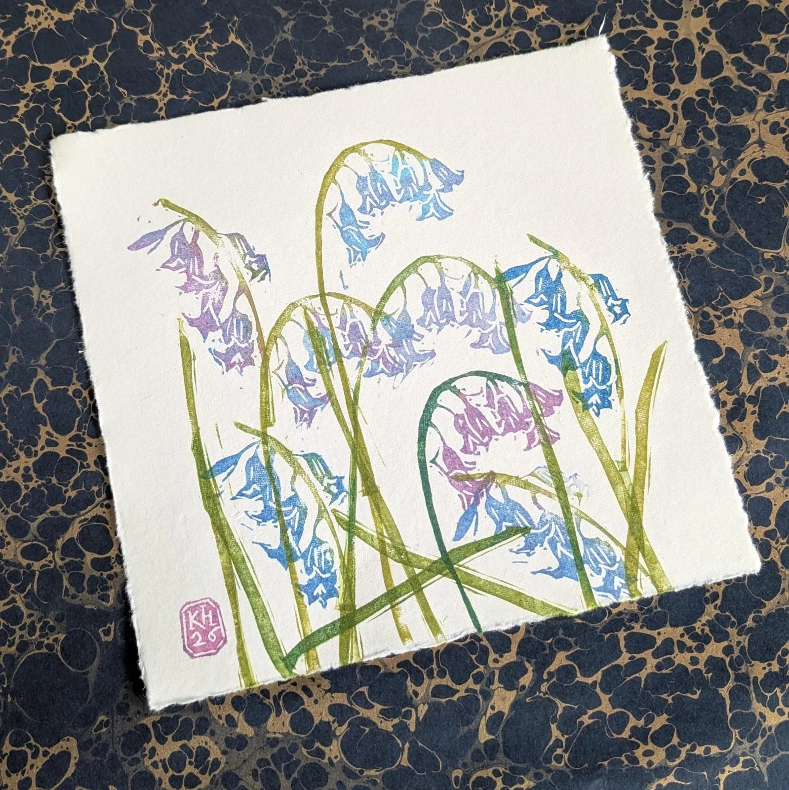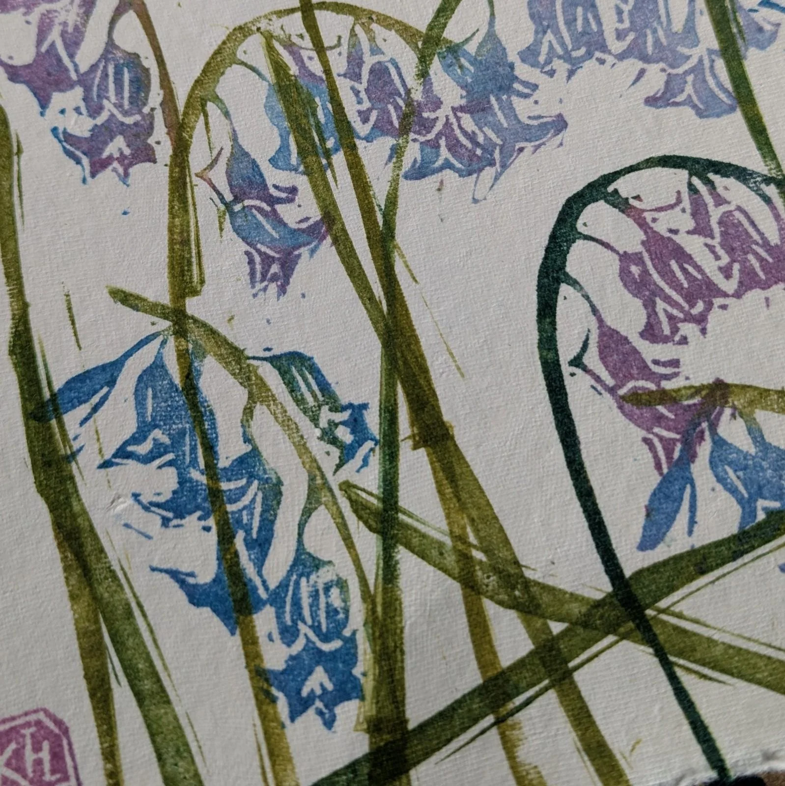 A modular, original lino print of the delicate forms of bluebells forming a woodland carpet. A mix of blues, purples and greens, reflecting the chaotic beauty of a patch of bluebells in the wild. Each print is made by printing individual blocks with different colour combinations and placement, so each composition is completely unique. Printed by hand onto cream cotton rag paper using hand-carved rubber blocks and archival inks. Each element has small differences in tone and texture, which is part of what makes it feel human and lived-in. Approximate size 8.5x8.5”