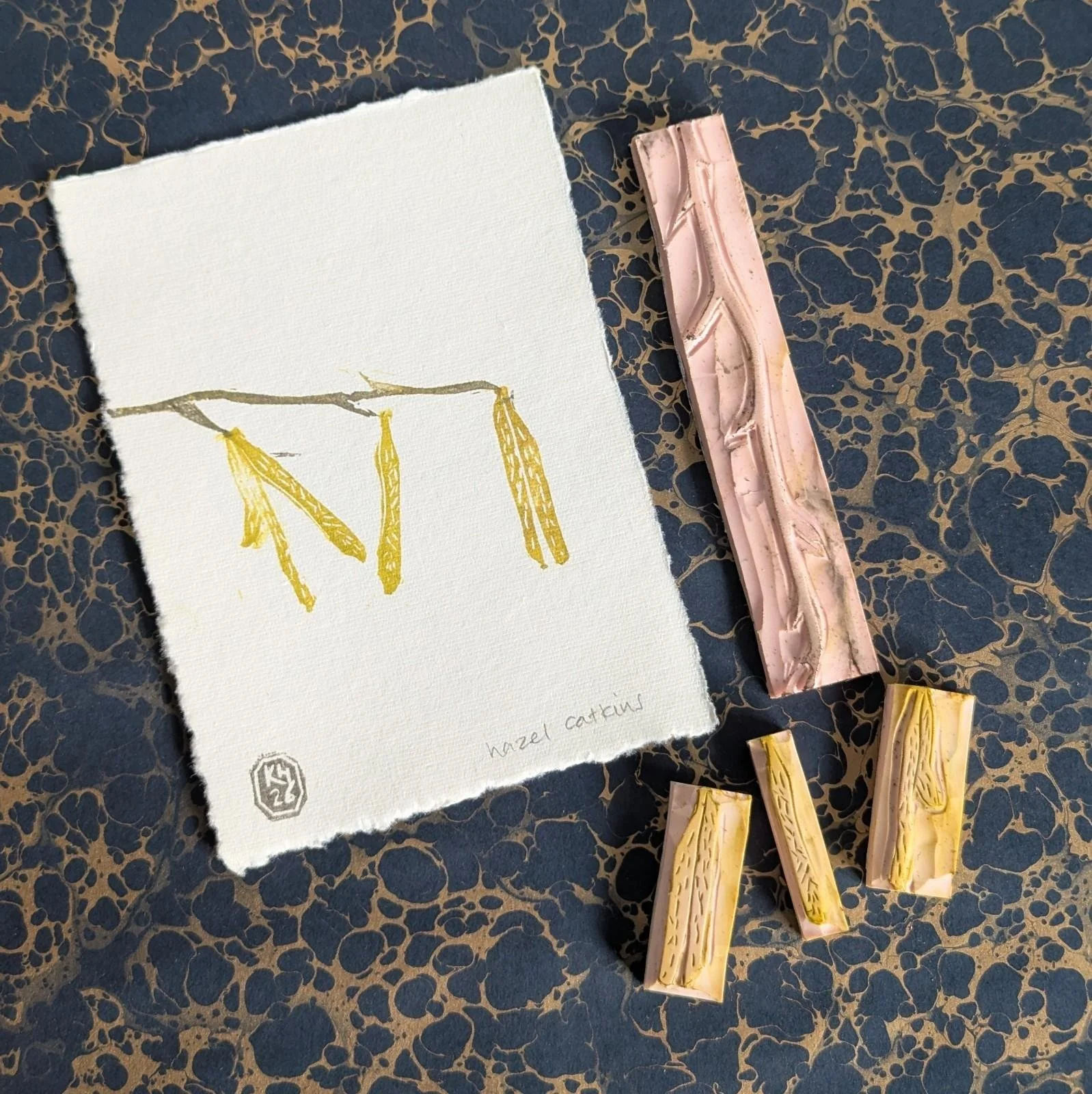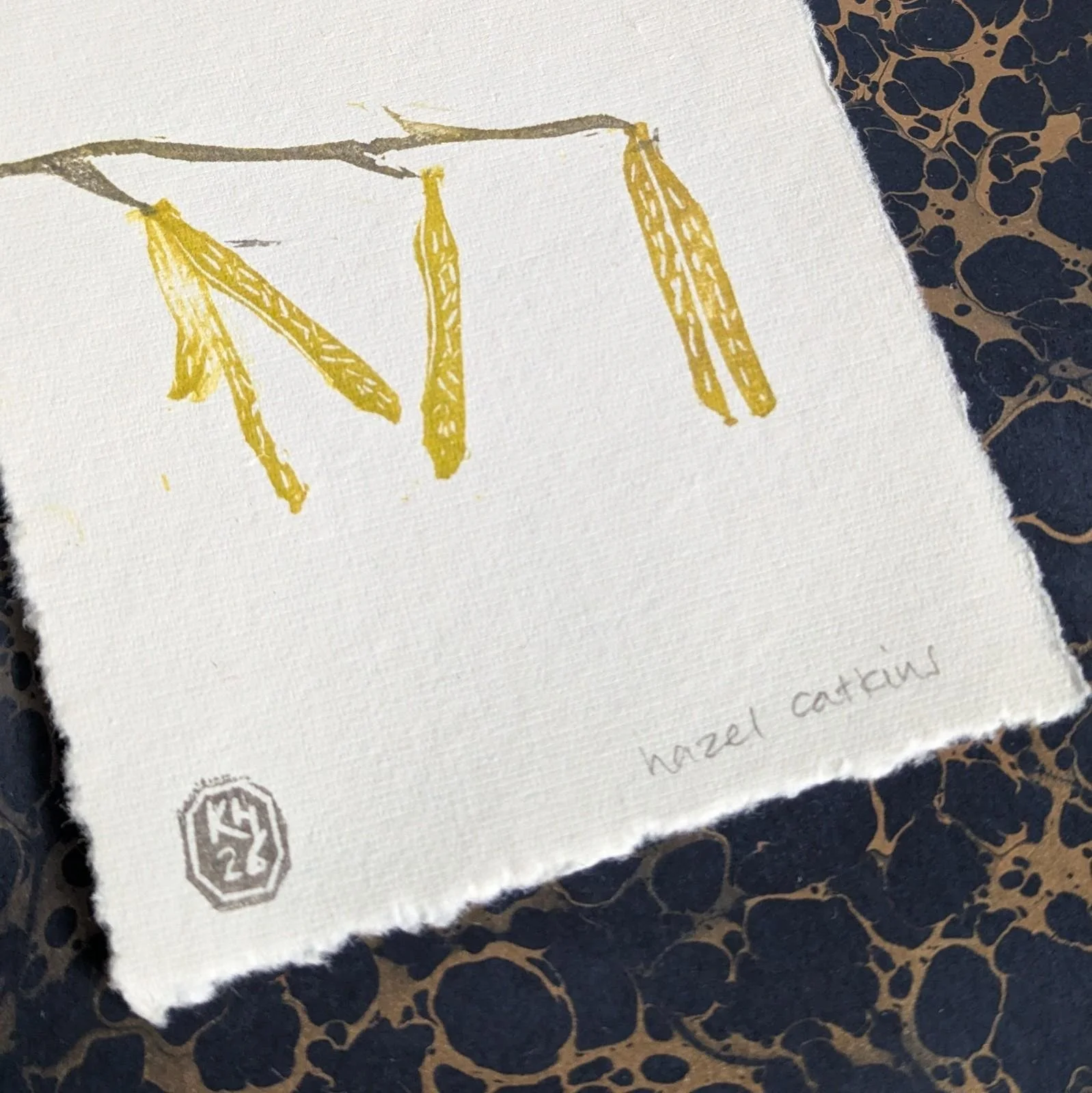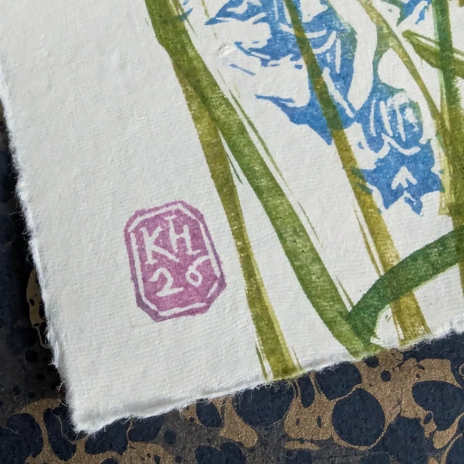 A modular, original lino print of the delicate forms of bluebells forming a woodland carpet. A mix of blues, purples and greens, reflecting the chaotic beauty of a patch of bluebells in the wild. Each print is made by printing individual blocks with different colour combinations and placement, so each composition is completely unique. Printed by hand onto cream cotton rag paper using hand-carved rubber blocks and archival inks. Each element has small differences in tone and texture, which is part of what makes it feel human and lived-in. Approximate size 8.5x8.5”