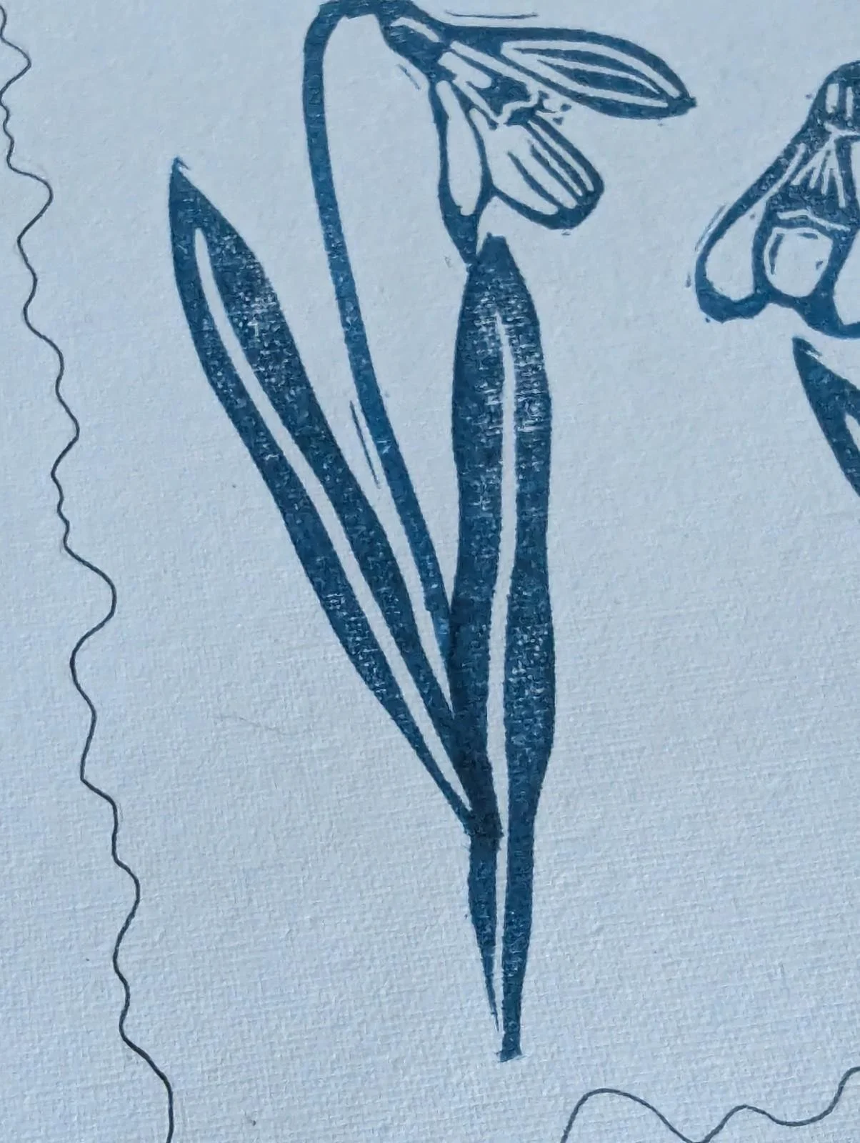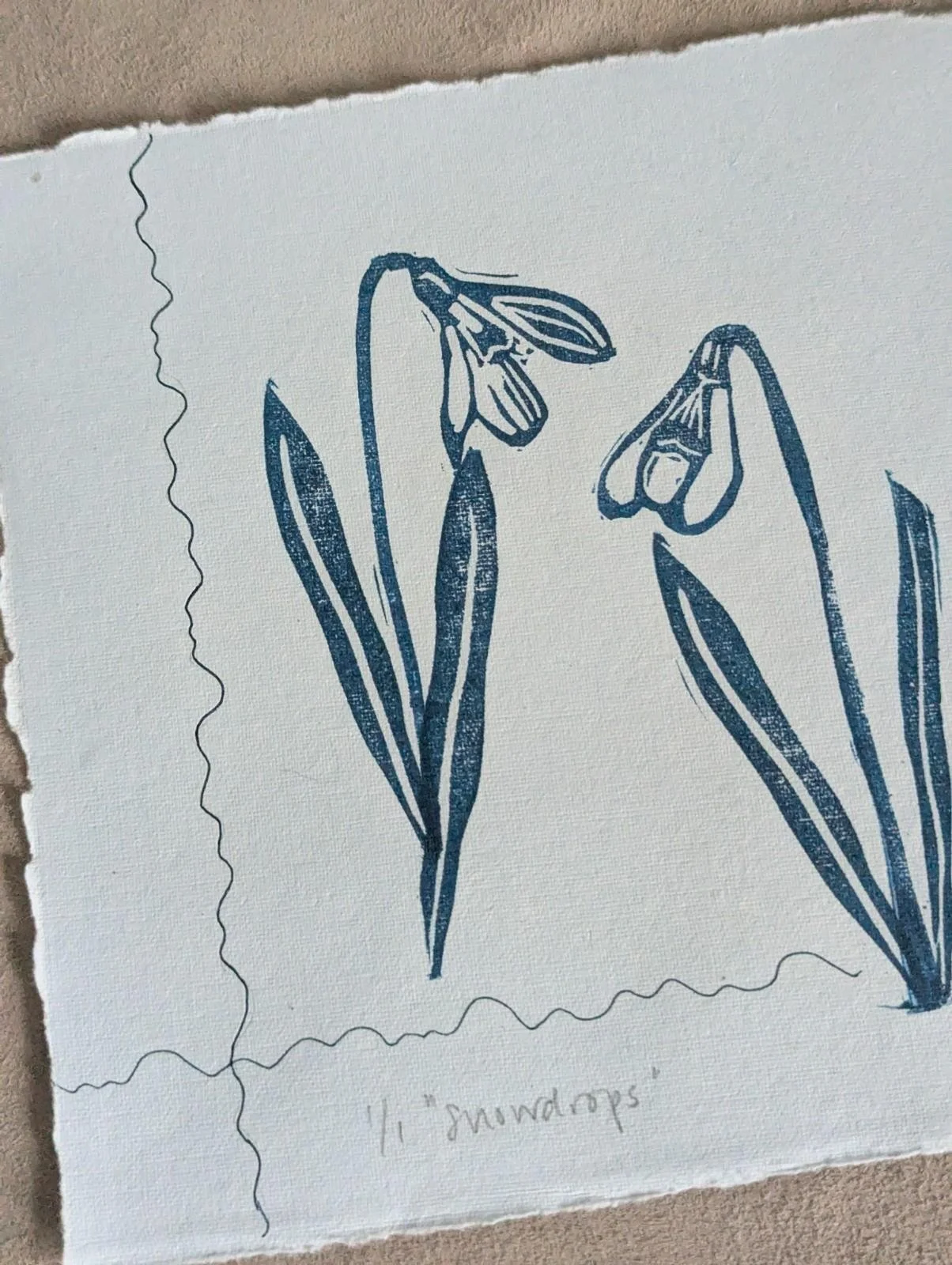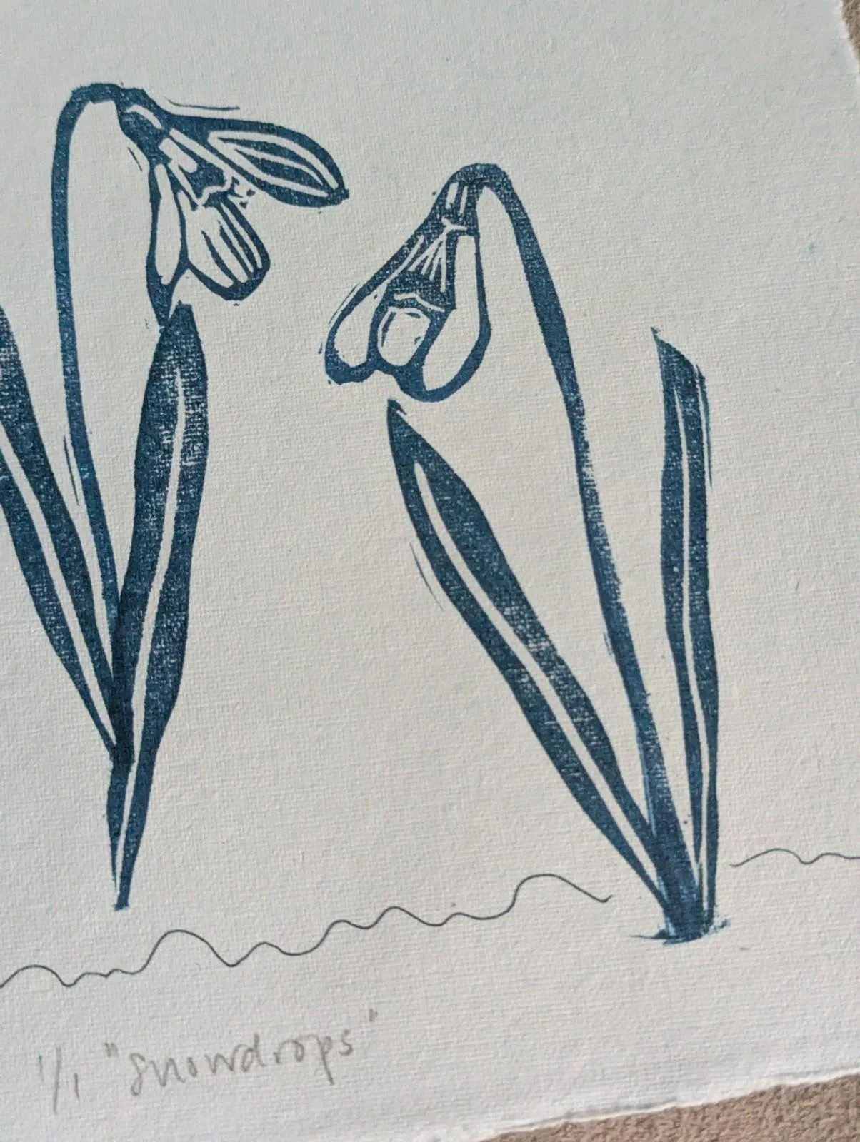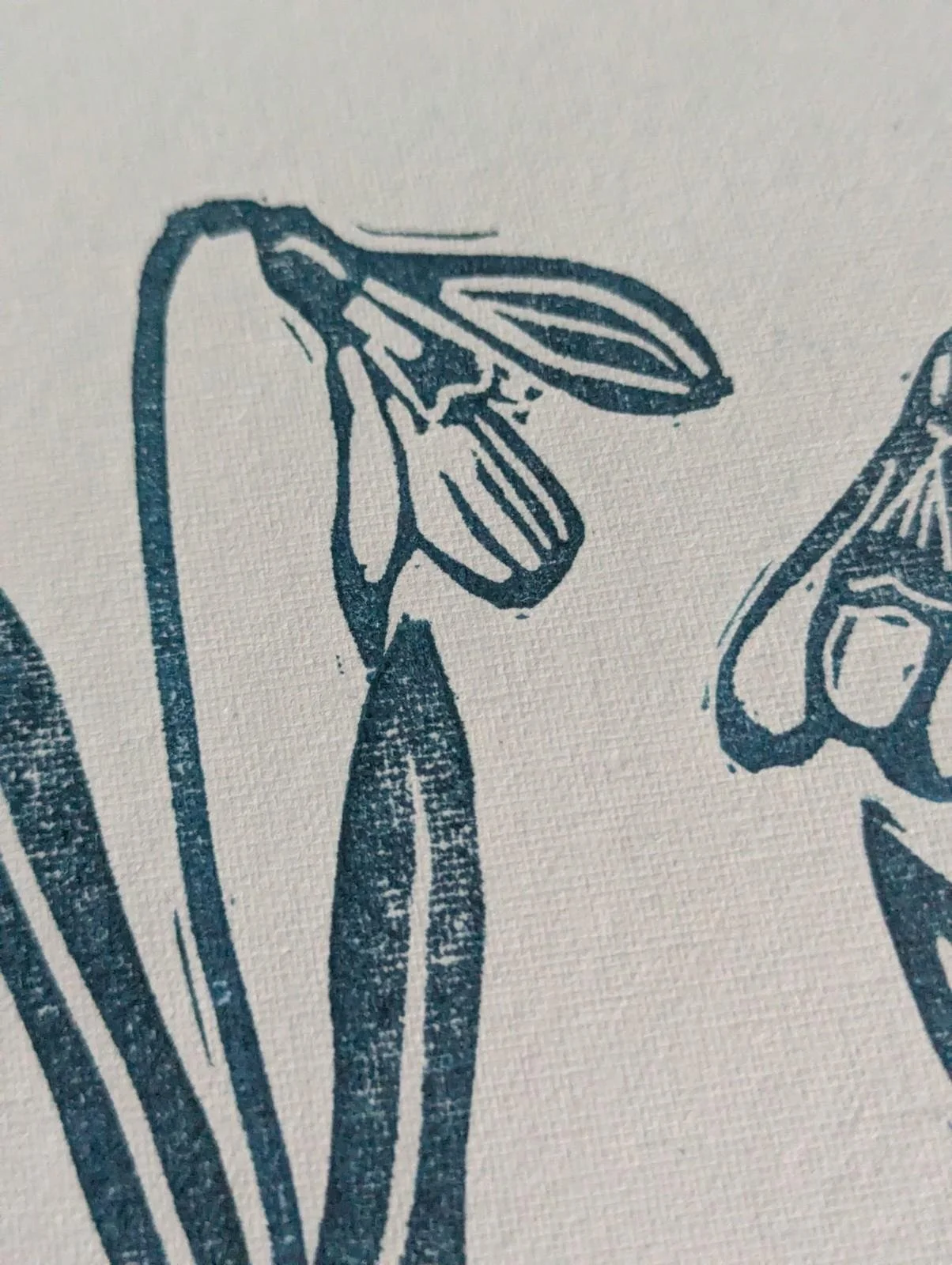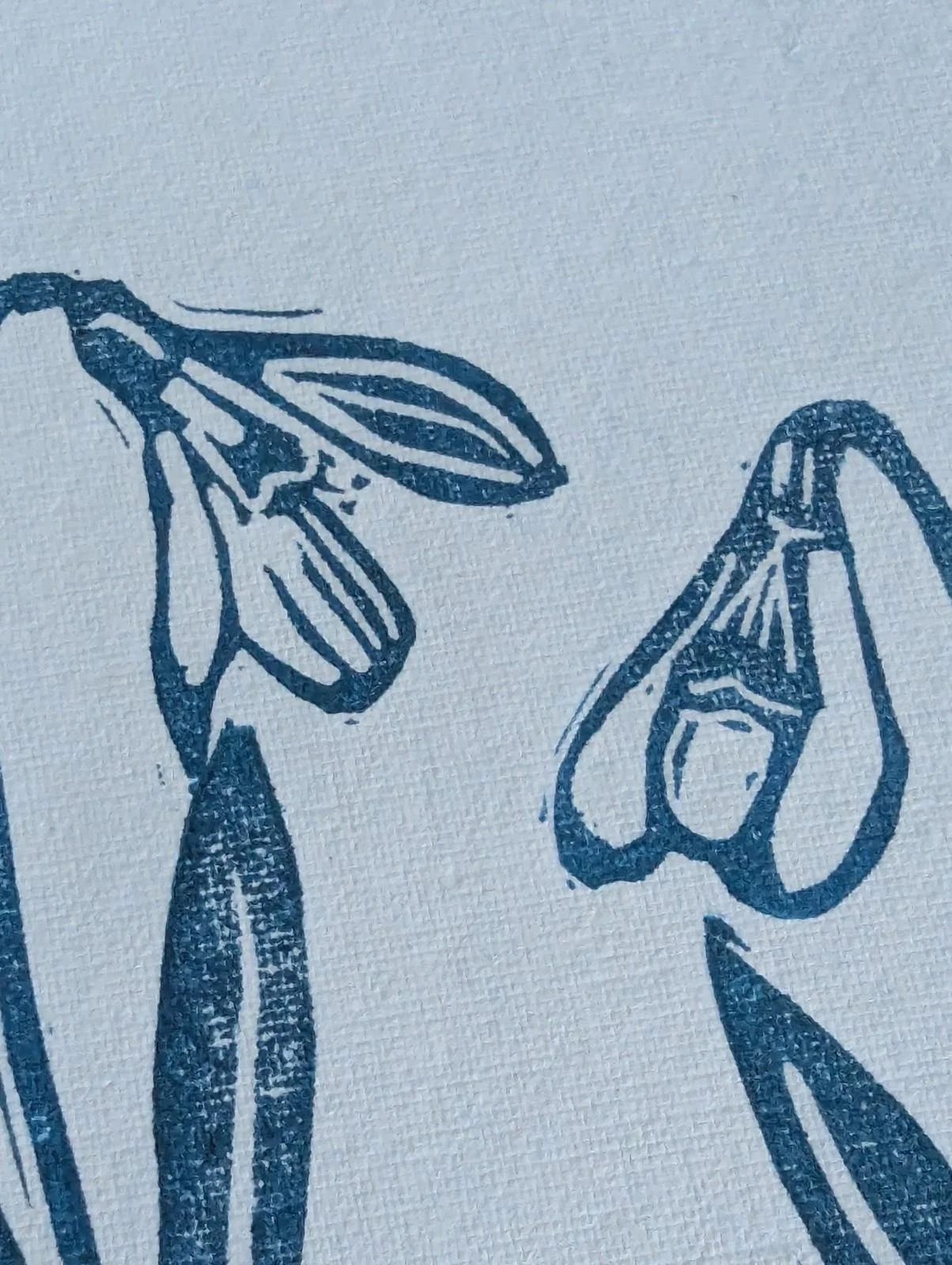This hand-printed piece features a pair of graceful and sculptural snowdrops. It's a sight that always makes me smile because it heralds sunshine and warmer days being on the way after the dreariness of winter. This is a piece to uplift the soul and bring joy.